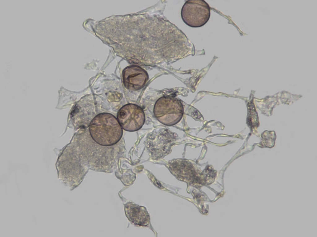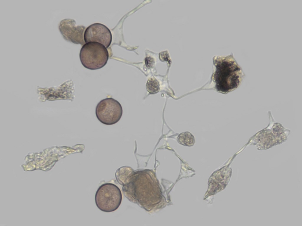dieser Fund ist vom 31.08.2023 (D-NRW) aus einem Laubmischwald. Sporocarpien sitzend, rundlich, eiförmig, länglich, 2-3mm. Peridie häutig, mit dünner Kalkauflage. Capillitium fädig mit großen Kalkknoten. Sporen dunkelbraun, 10-10,8 µm schwach warzig. Wir kommen bei der Bestimmung auf Physarum cinereum. Kann das jemand bestätigen oder spricht etwas dagegen?