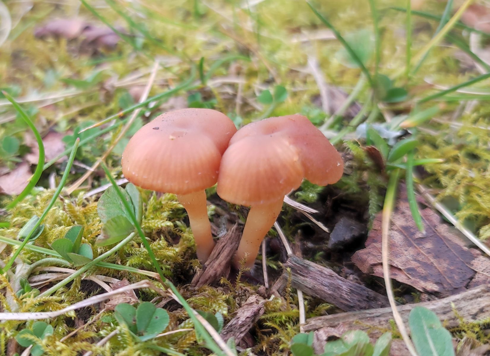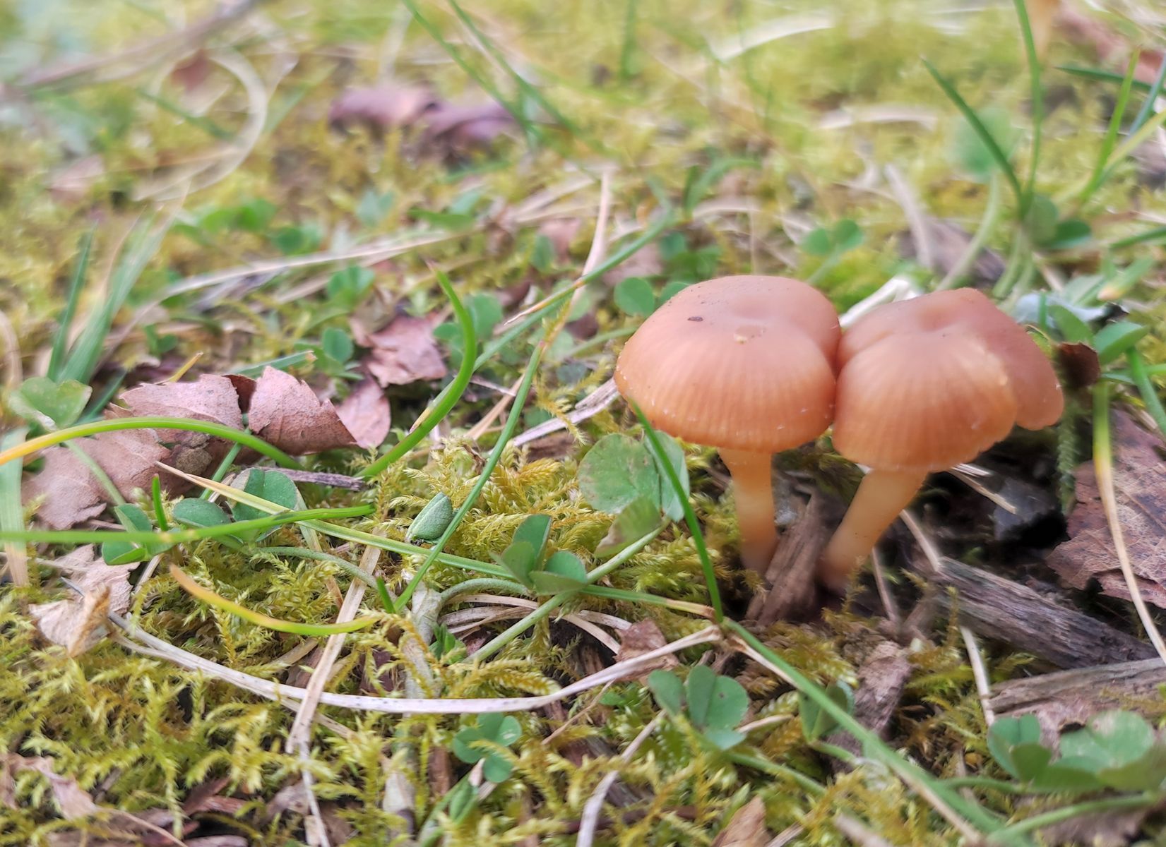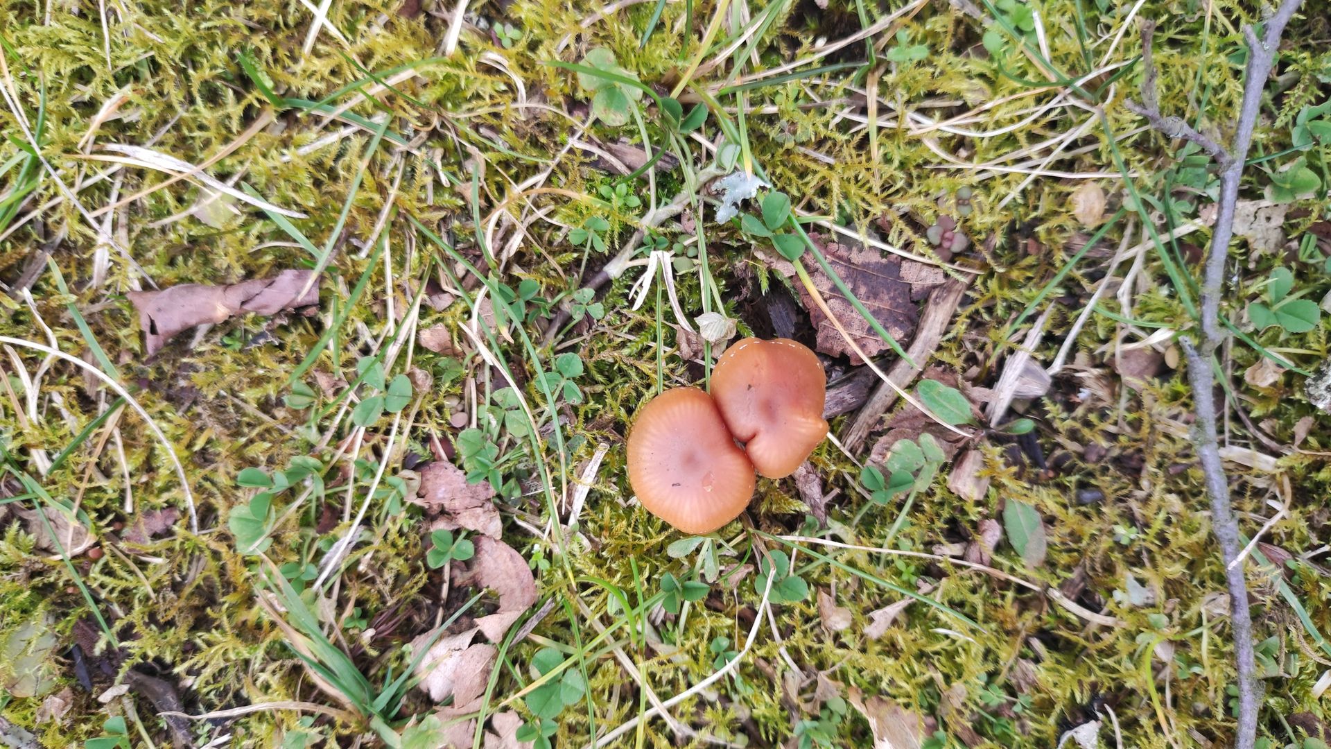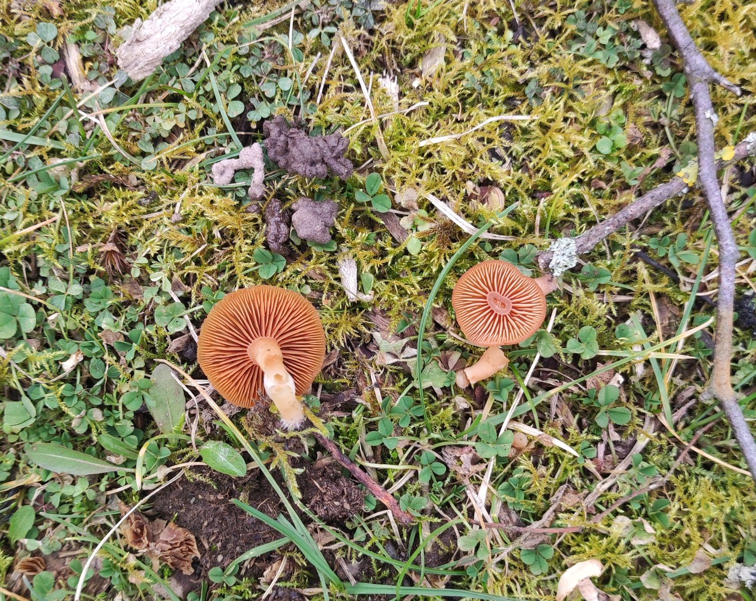trotz leichtem Frost seit Tagen fand ich gestern auf der Wiese vor der Schule diese frischen Pilzchen. Sie waren nicht verfroren oder matschig. Die liegenden waren schon umgetreten, als ich kam. Stiel hohl, Hut, Stiel und Lamellen mehr oder weniger rötlich-braun. Hut radial gezeichnet, leicht genabelt.