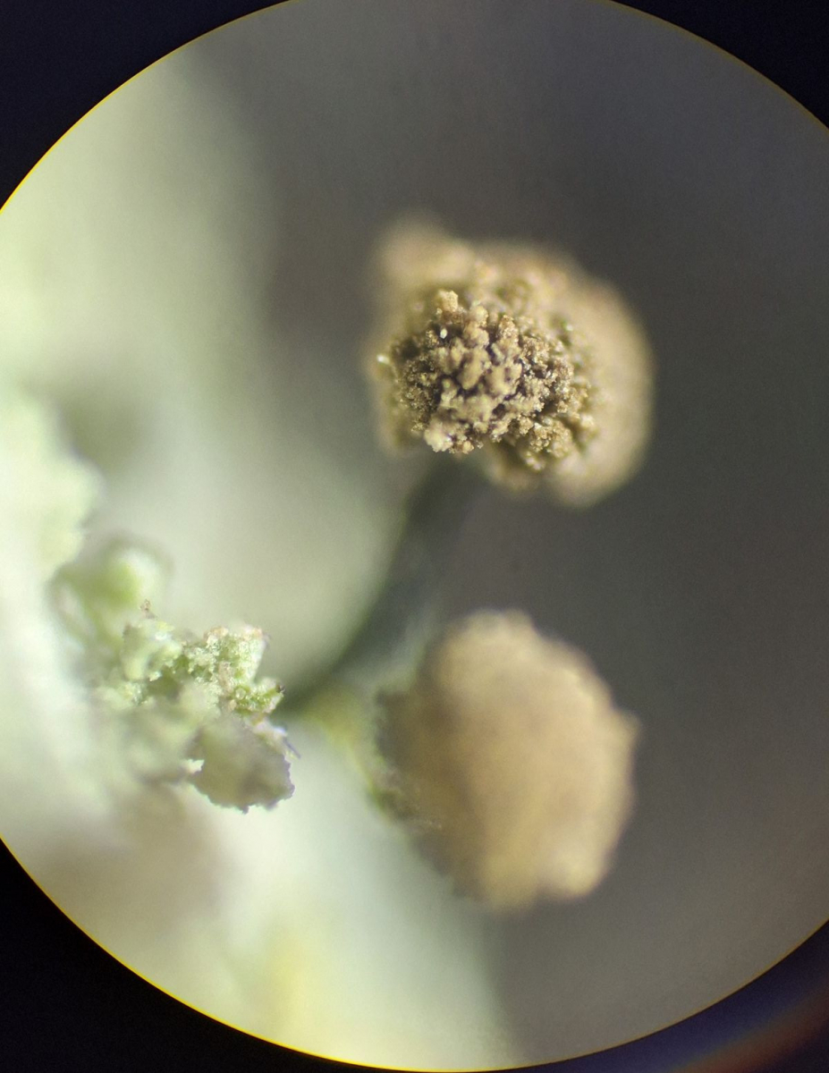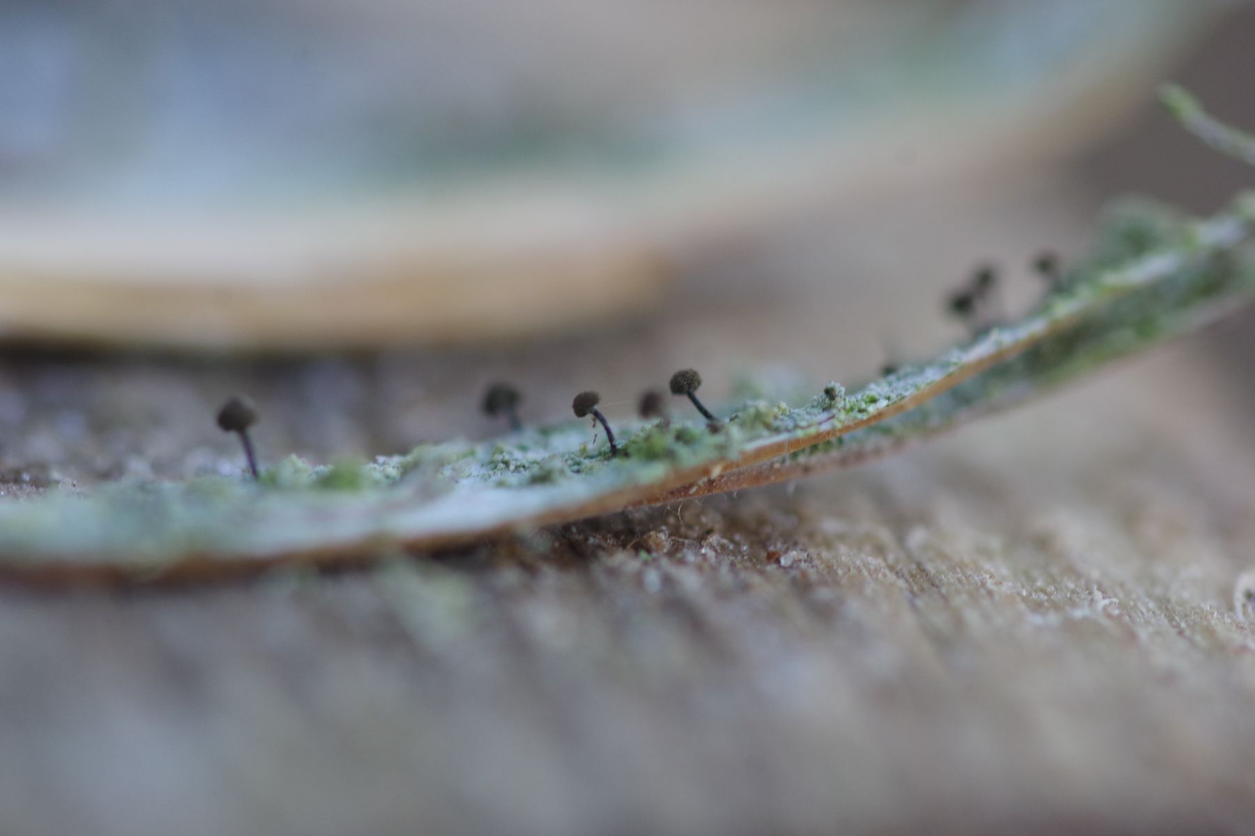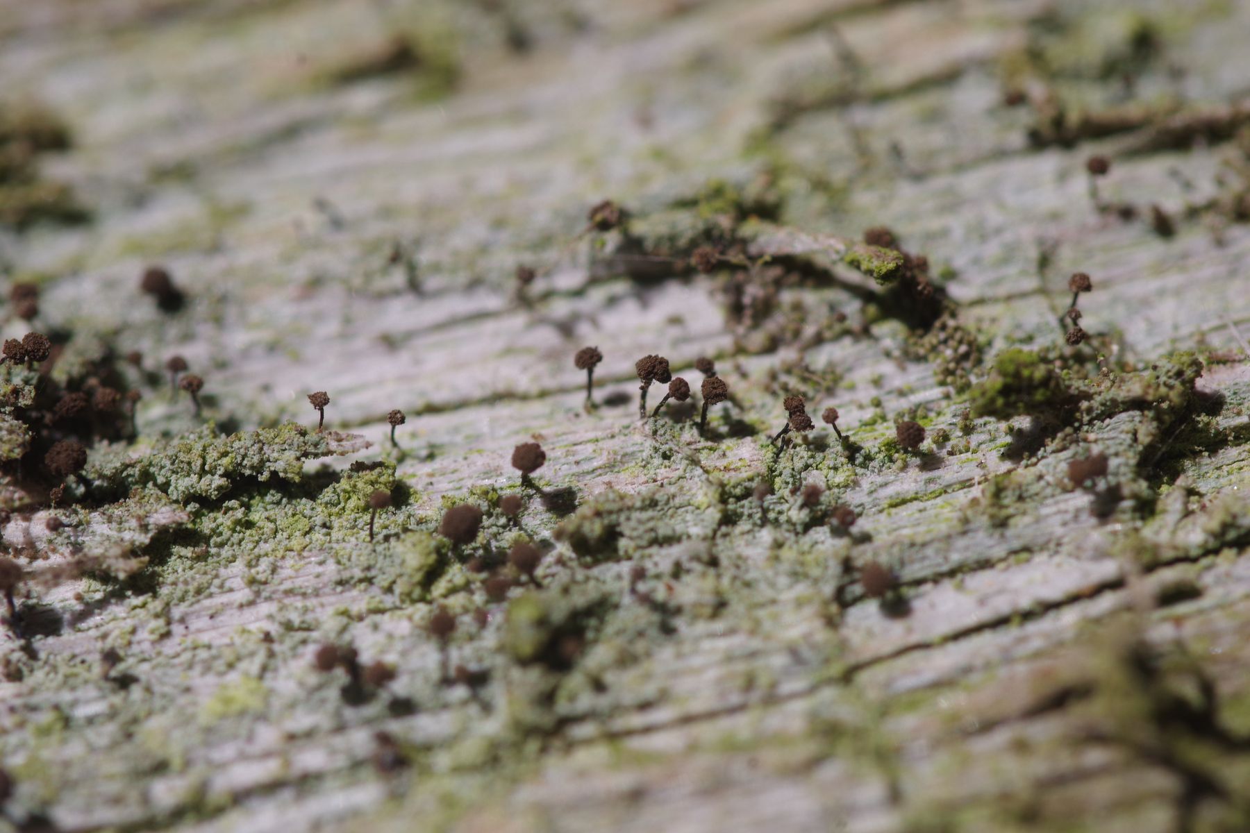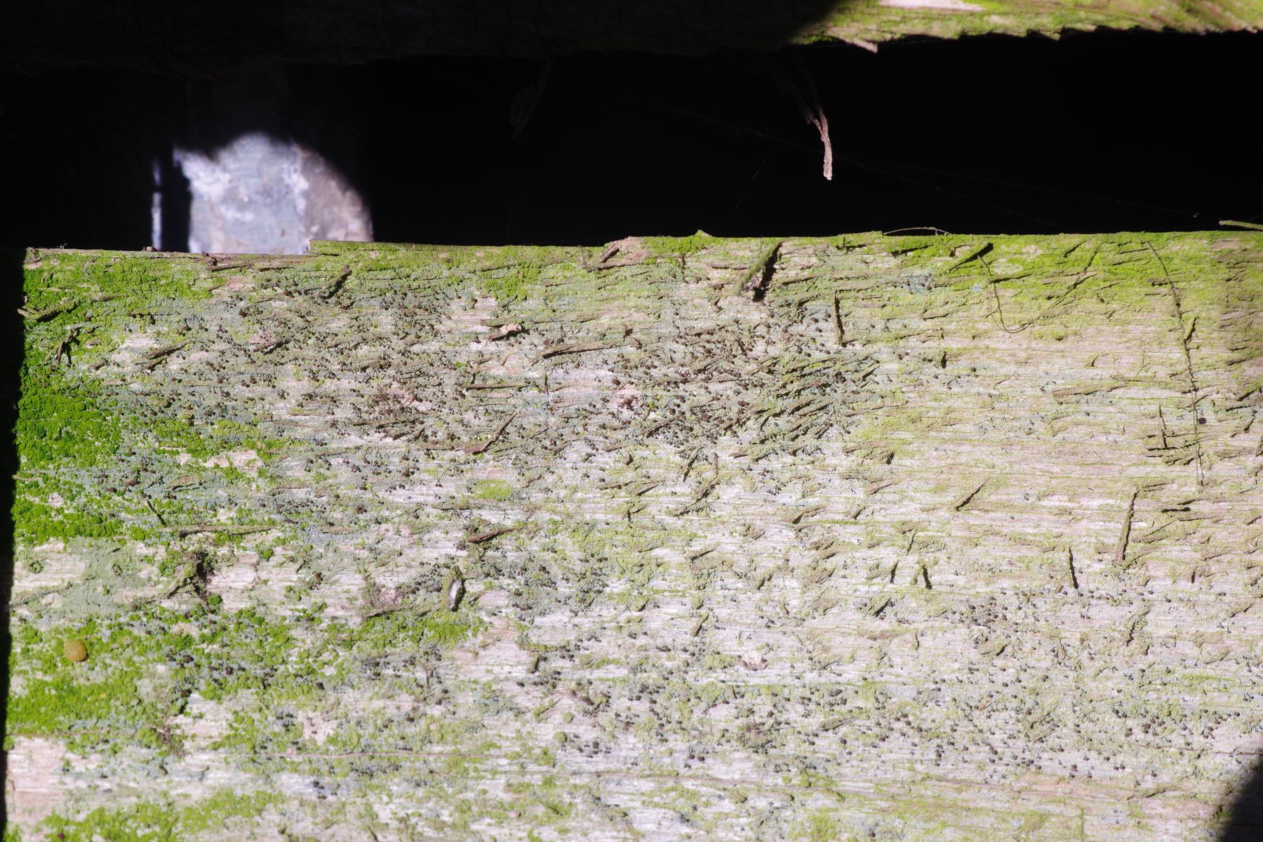 da ich gerade bei den Stecknadelflechten bin, hab ich noch eine andere Art eingesammelt. Direkt vom Hof am Brennholzschuppen (anno etwa 1980), an den oberen Fichtenbrettern. Südseite, durch das überstehende Dach regengeschützt