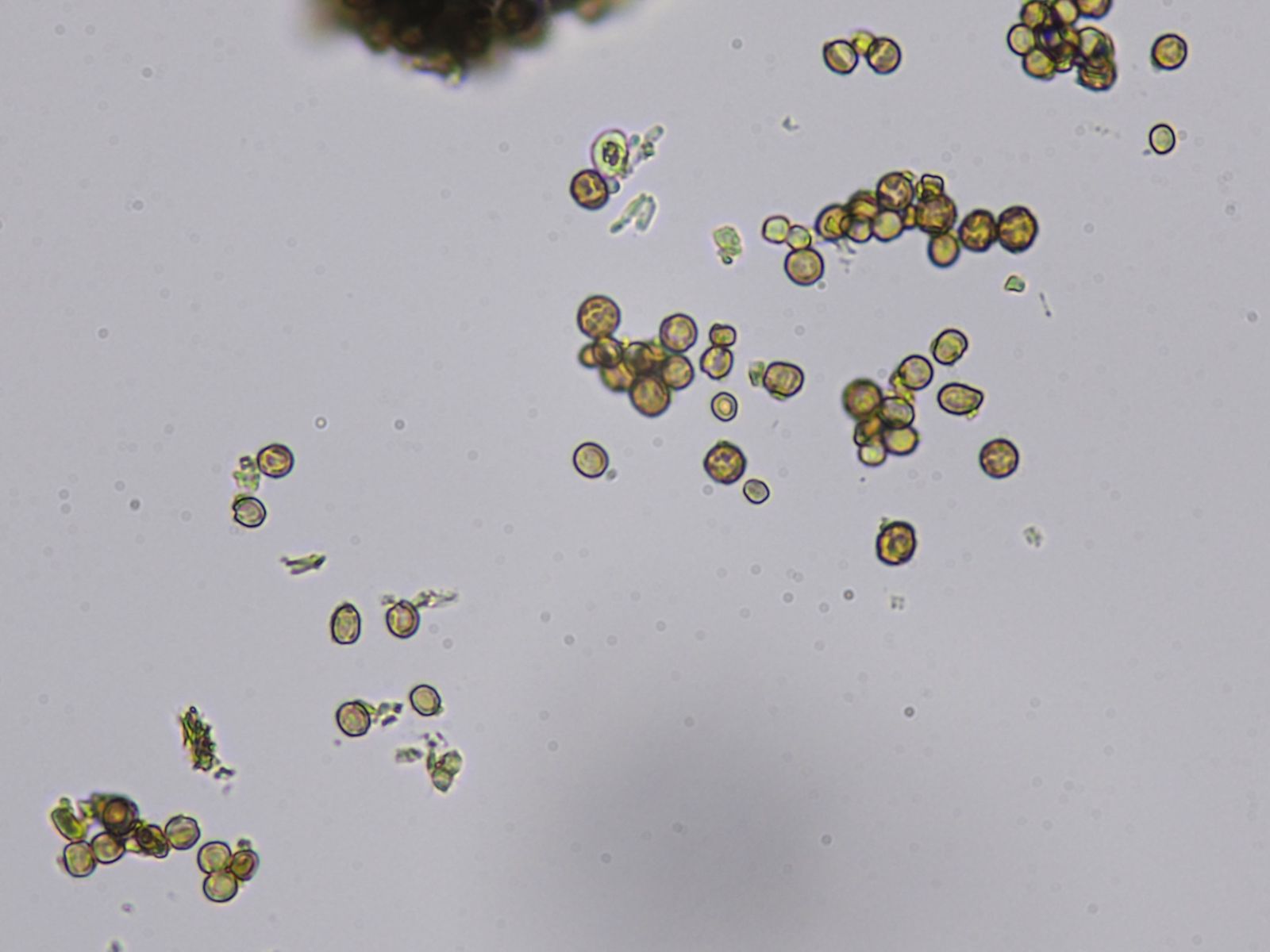 Weiterhin keine stabförmigen Algen. Die Form der Sporen kann man zwar mit etwas gutem Willen auch als überwiegend elliptisch bezeichnen - denn wo gibt es in der belebten Natur schon mathematisch perfekte Kreise?
