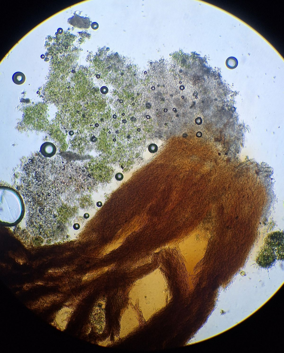 vor Ort nicht gesehen, erst unterm Mikro entdeckt, daneben ist noch eine deutlich winzigere gelbe Stecknadel auf grauem Lager