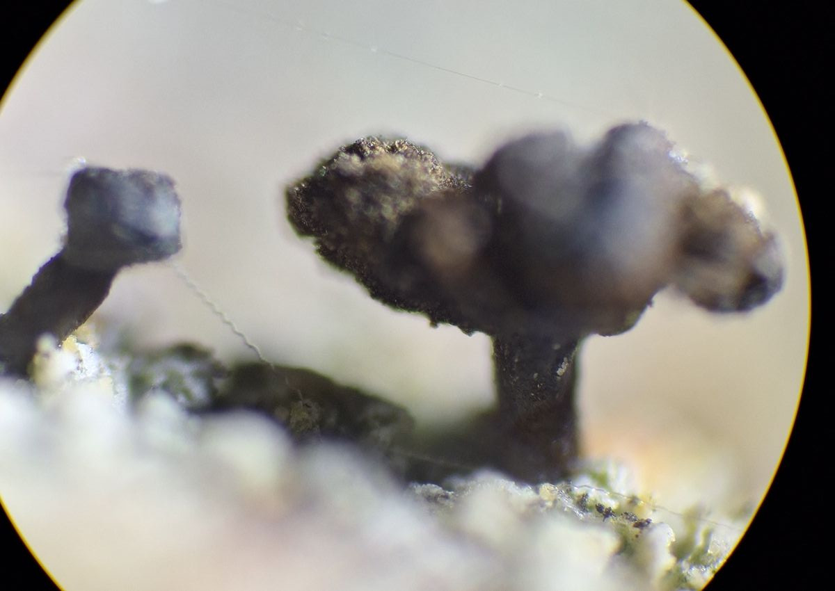 • Hallo Bernd, das ist Ch. ferruginea. Auch makroskopisch bereits gut kenntlich in der Kombination aus an manchen Stellen deutlich gelblich/ocker verfärbtem Lager und für Stecknadelflechten sehr kräftigen FK (auch ohne Lesebrille zu erkennen) mit schwarzem Stiel und dunkelbraunem, meist konvexem Mazaedium.