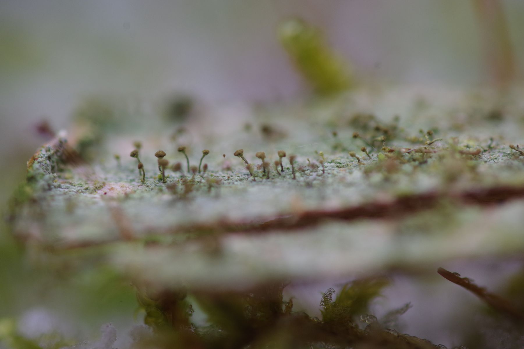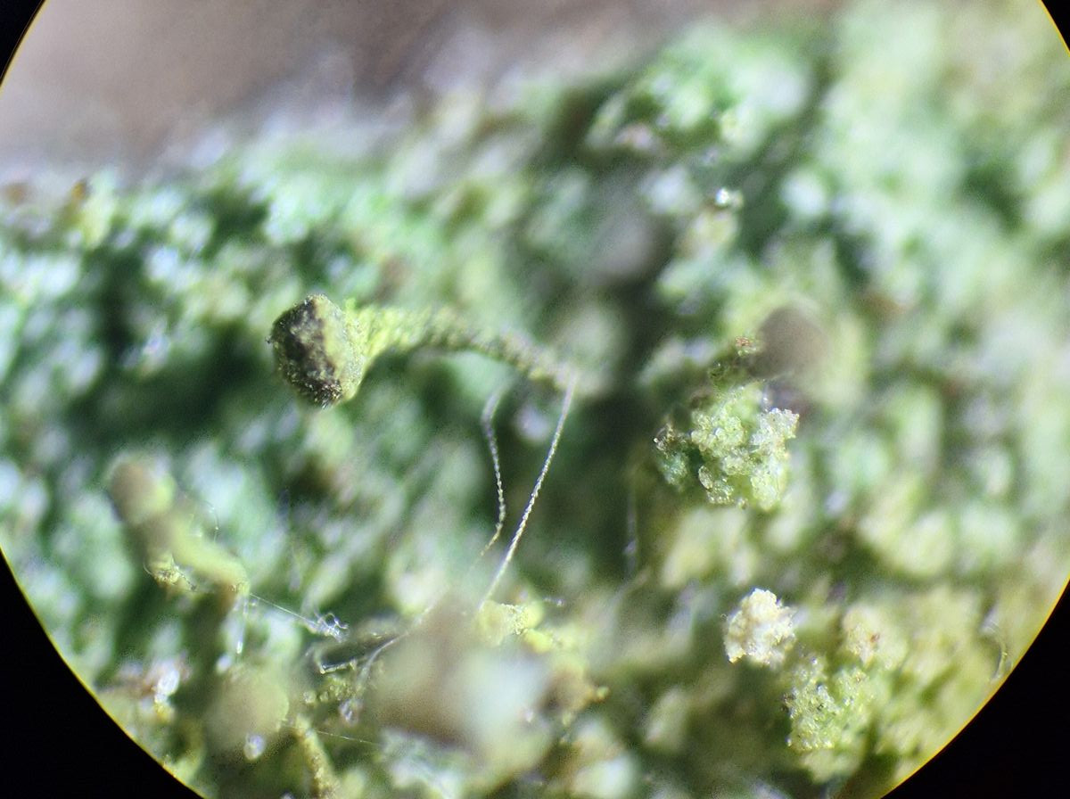 Asci sind vorhanden, trotzdem schlüssele ich nach Mazaedium vorhanden - so ähnliche Bilder finden sich hier http://crustose.net/calicioids…=14#Chaenotheca_chlorella