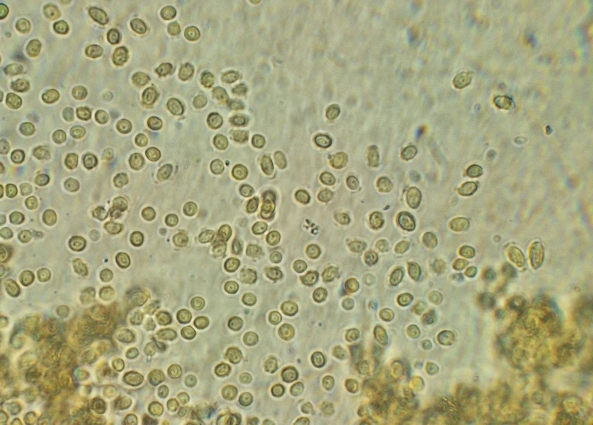 Sporen von rund 2,5-4 µm bis zu 3*6 µm länglich, rauhe Oberfläche