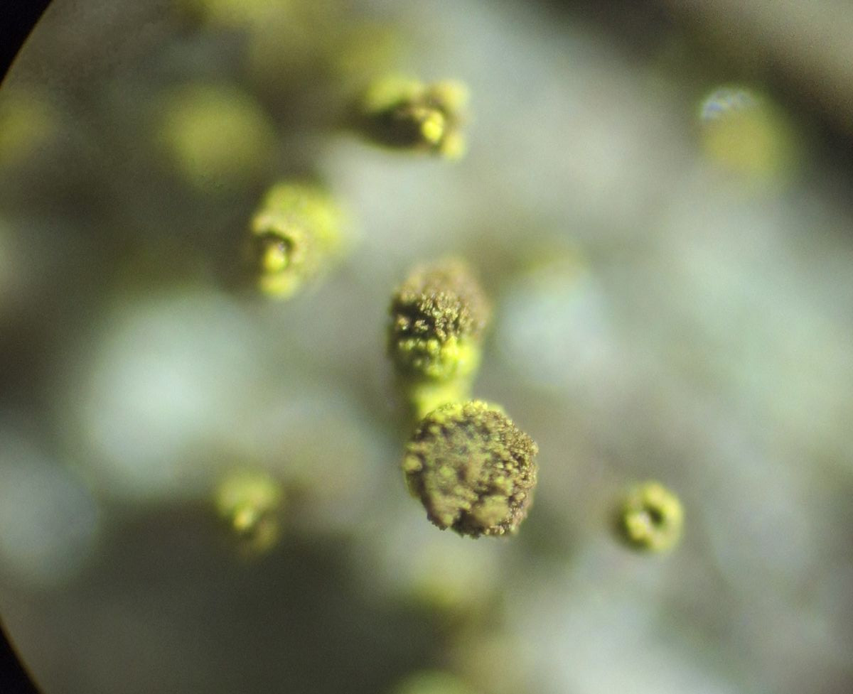 Asci sind vorhanden, trotzdem schlüssele ich nach Mazaedium vorhanden - so ähnliche Bilder finden sich hier http://crustose.net/calicioids…=14#Chaenotheca_chlorella
