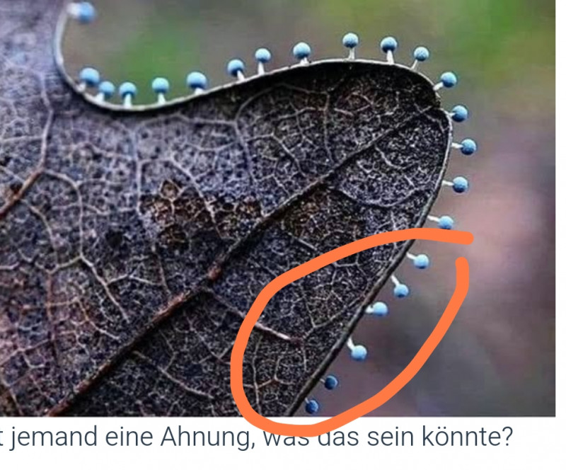 Ich könnte mir gut vorstellen, dass der Schleimpilz gar nicht nur entlang des Rands des Blattes saß, sondern flächig auf der ganzen anderen Seite des Blattes zu finden ist, und wir eben von der Rückseite nur die Exemplare sehen, die durch den etwas zu uns umgebogenen Blattrand seitlich raus stehen.