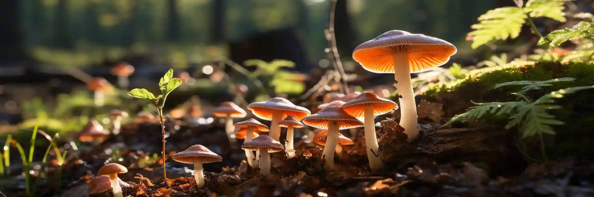 Aufgabe an die KI: mache ein Bild im Wald mit Moos, Sonnenstrahlen, kleinen Pilzen. Fertig.