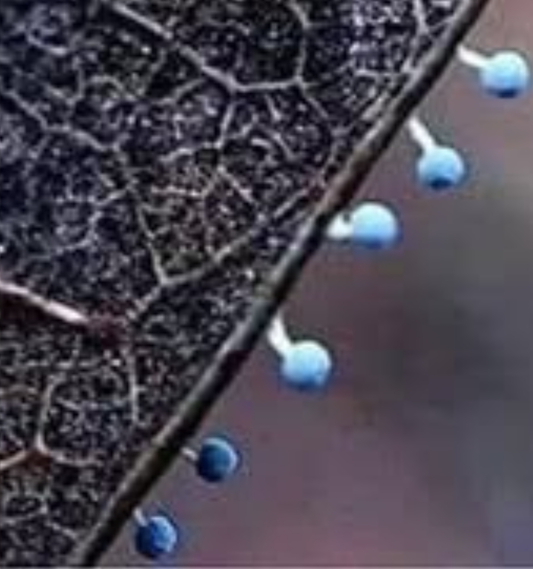 Ich könnte mir gut vorstellen, dass der Schleimpilz gar nicht nur entlang des Rands des Blattes saß, sondern flächig auf der ganzen anderen Seite des Blattes zu finden ist, und wir eben von der Rückseite nur die Exemplare sehen, die durch den etwas zu uns umgebogenen Blattrand seitlich raus stehen.