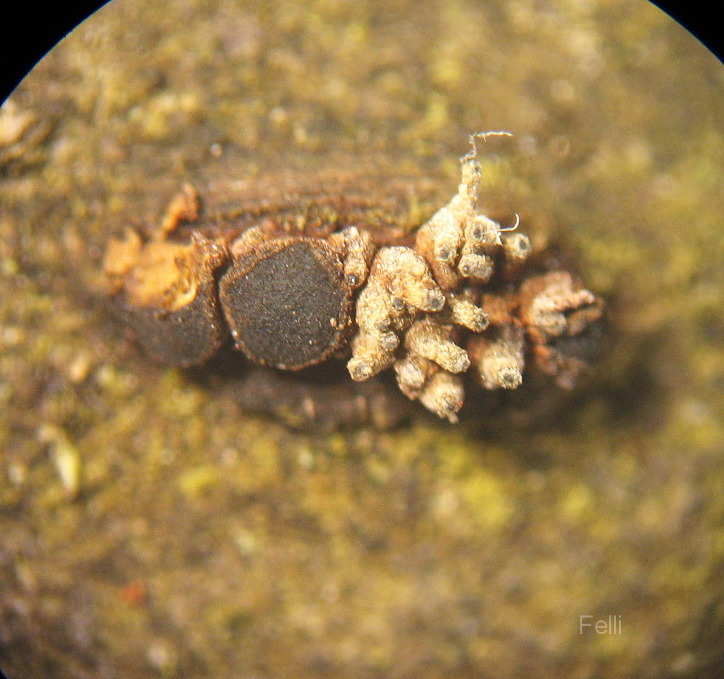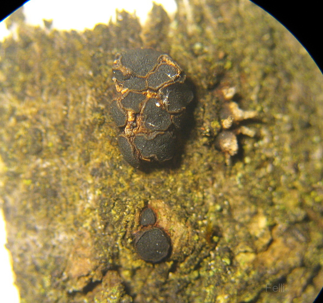 dunkle kleine Becherlinge zusammen mit der dazugehörigen Nebenfruchtform auf der Rinde