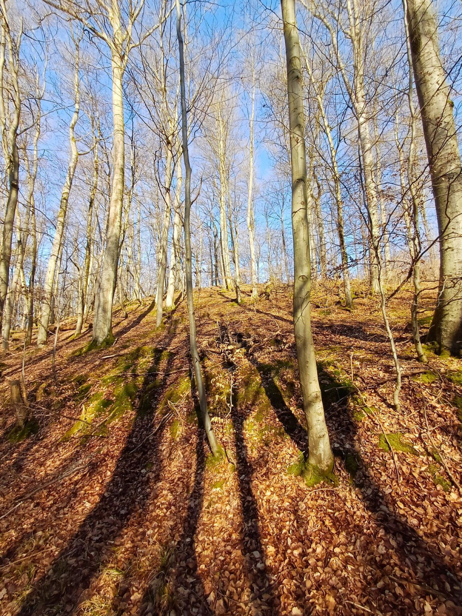 Buchenwald, nach Südost gerichtete Abbruchkante zu einem Waldweg hin.