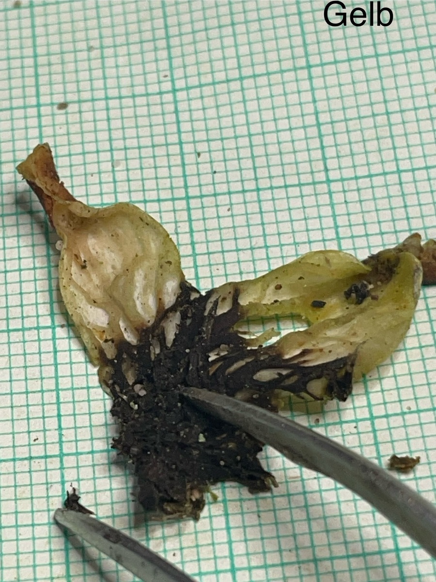 Die Apothecien auf dem ersten Foto sind recht dunkel, die sattelförmigen Exemplare sieht man nur von unten.