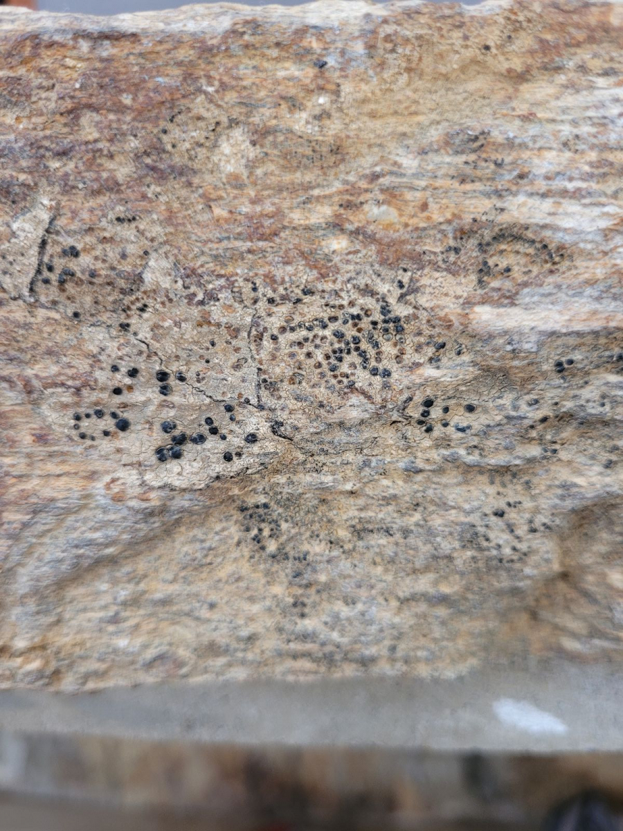können das nicht auch Apothecien einer Flechte sein ? Die Flechte an sich ist vielleicht der "rissige" Bereich um die schwarzen Punkte, zufällig in derselben Farbe wie der Stein ?