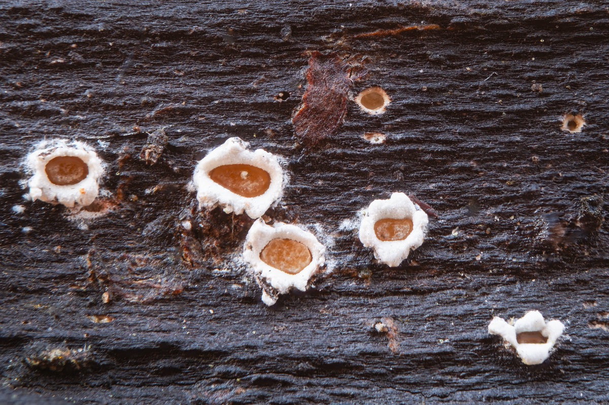 dieses weißen Gebilde habe ich vorgestern unter einem morschen Lauholzast in einem Auenwald gefunden. Eigentlich war ich auf der Suche nach Schleimpilzen. Zuerst habe ich an Weißhaarbecherchen gedacht. Doch schon unter der Lupe sahen sie anders aus. Die einzelnen Gebilde sind wenige Millimeter groß.