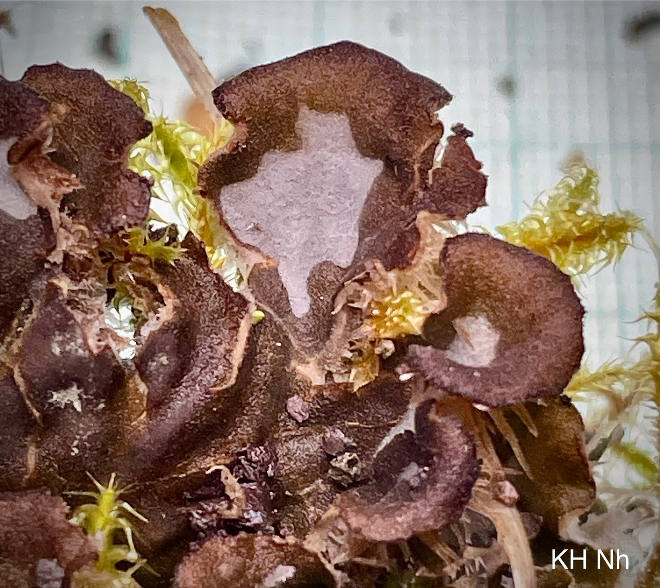 Lager Rotbraun,derb, fast knorpelig , Lappen 2x5 cm,mit Längswülsten, fleckig filzig behaart, wuchs im Schatten im