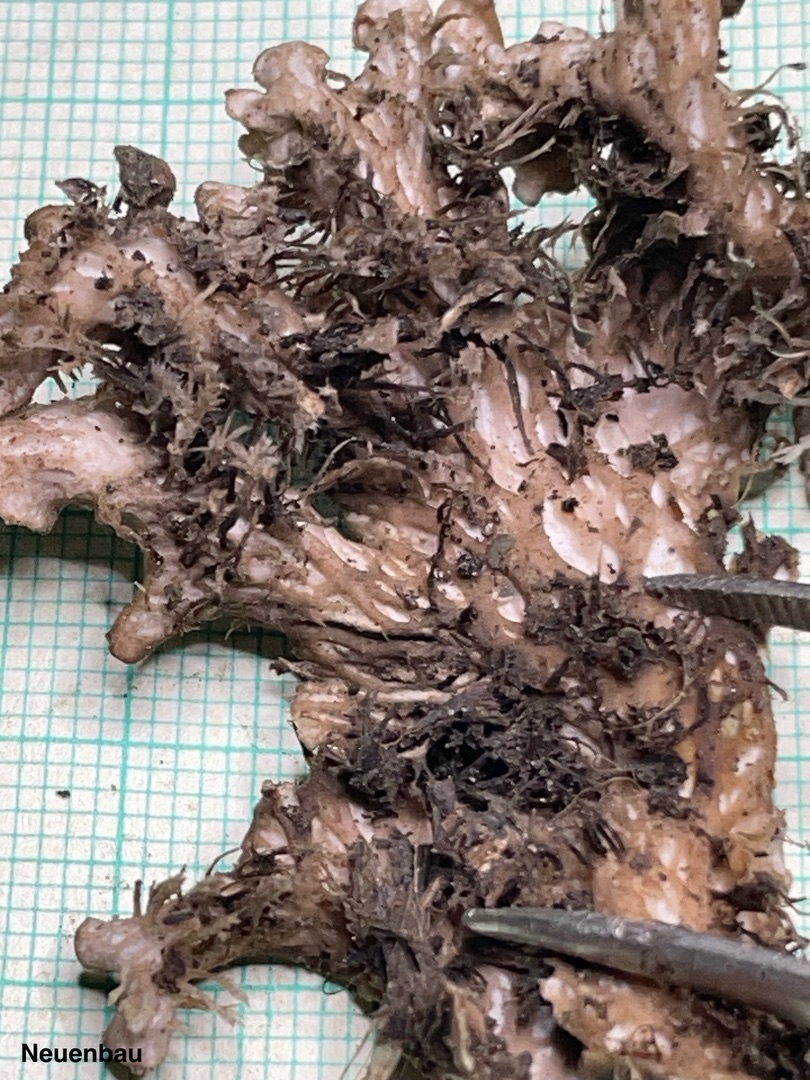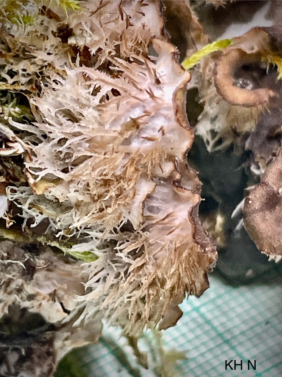 Lager Rotbraun,derb, fast knorpelig , Lappen 2x5 cm,mit Längswülsten, fleckig filzig behaart, wuchs im Schatten im