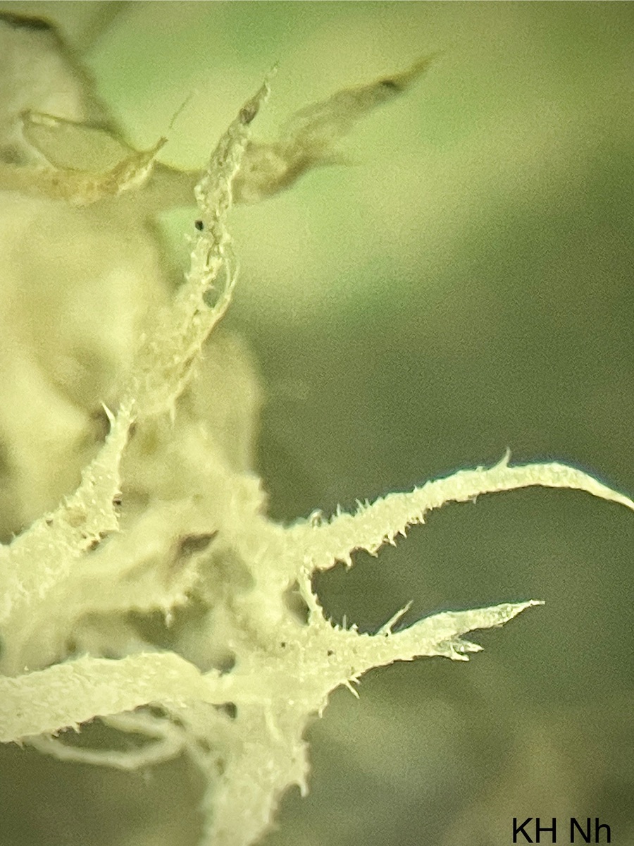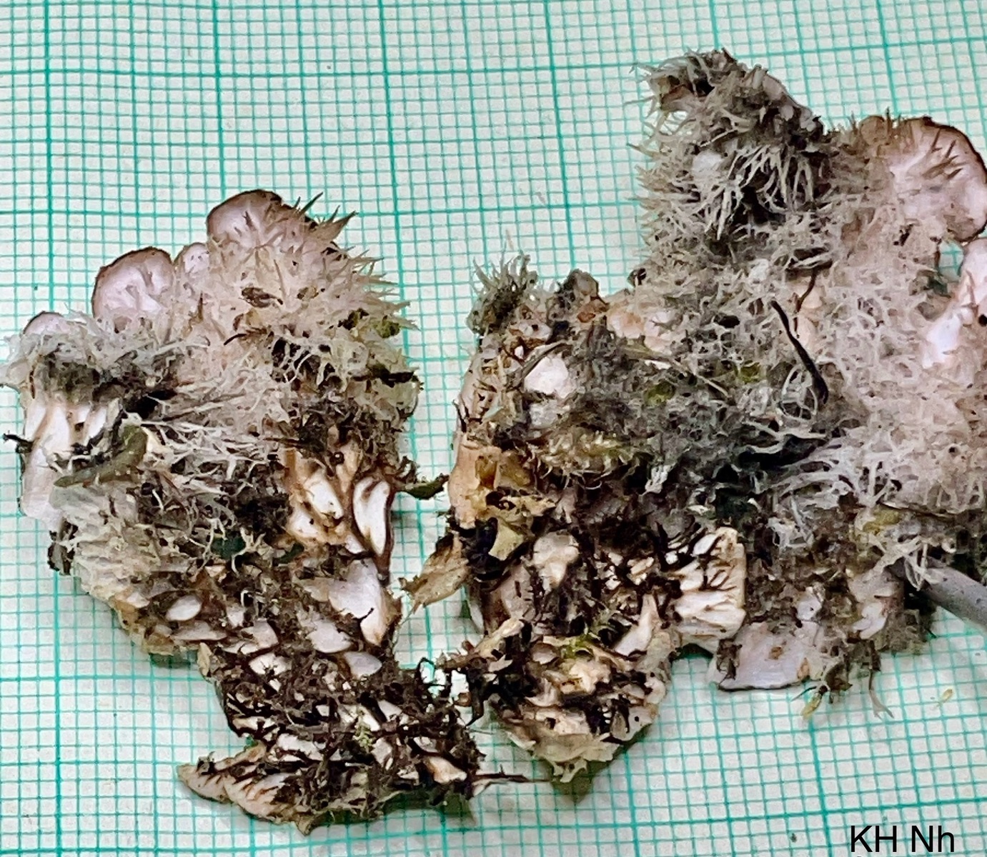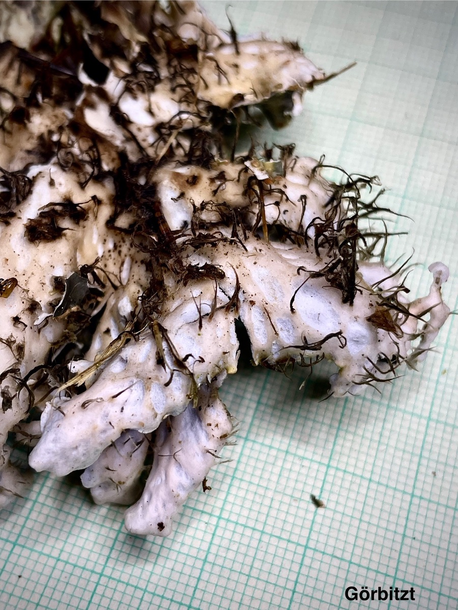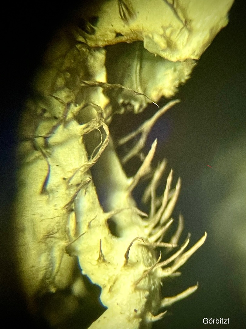 US durchgängig weiß, Rhizinen im Randbereich einfach weiß, +/- abstehend behaart,dann auffasernd und im breiten Streifen