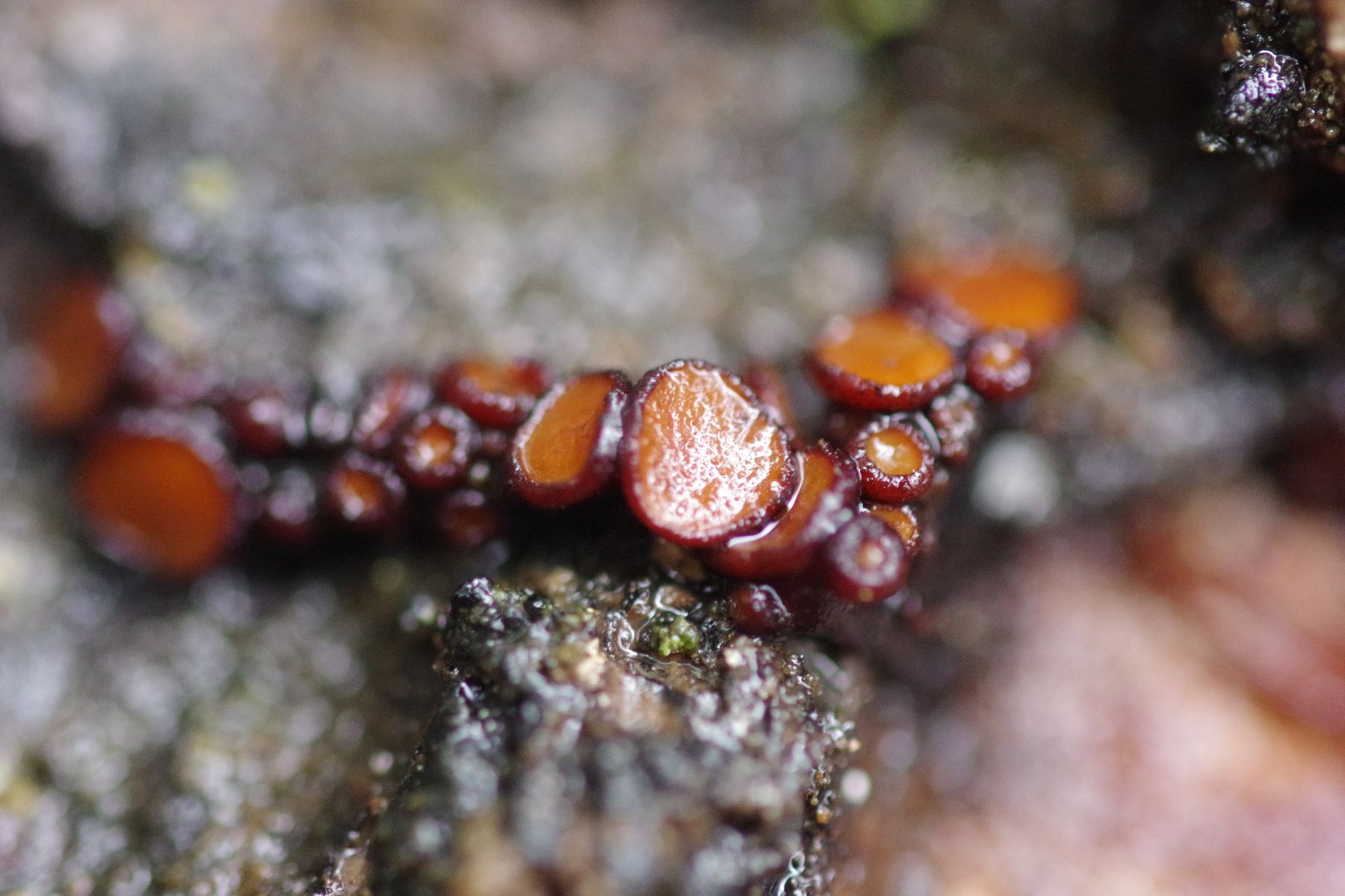 bei einem Waldbrand vor etwa 20 Jahren hat es (u.a.) eine Fichte im Bodenbereich schwer angebrannt, die dann stark harzte, noch ein paar Jahre vor sich hin kränkelte, vor etwa 3-4 Jahren sind die sterblichen Überreste umgefallen. An diesem Stubben, in der harzreichen Fichtenrinde wächst ein dunkler Becher, deutlich gestielt, die größten Exemplar über 2 mm. In Büscheln.