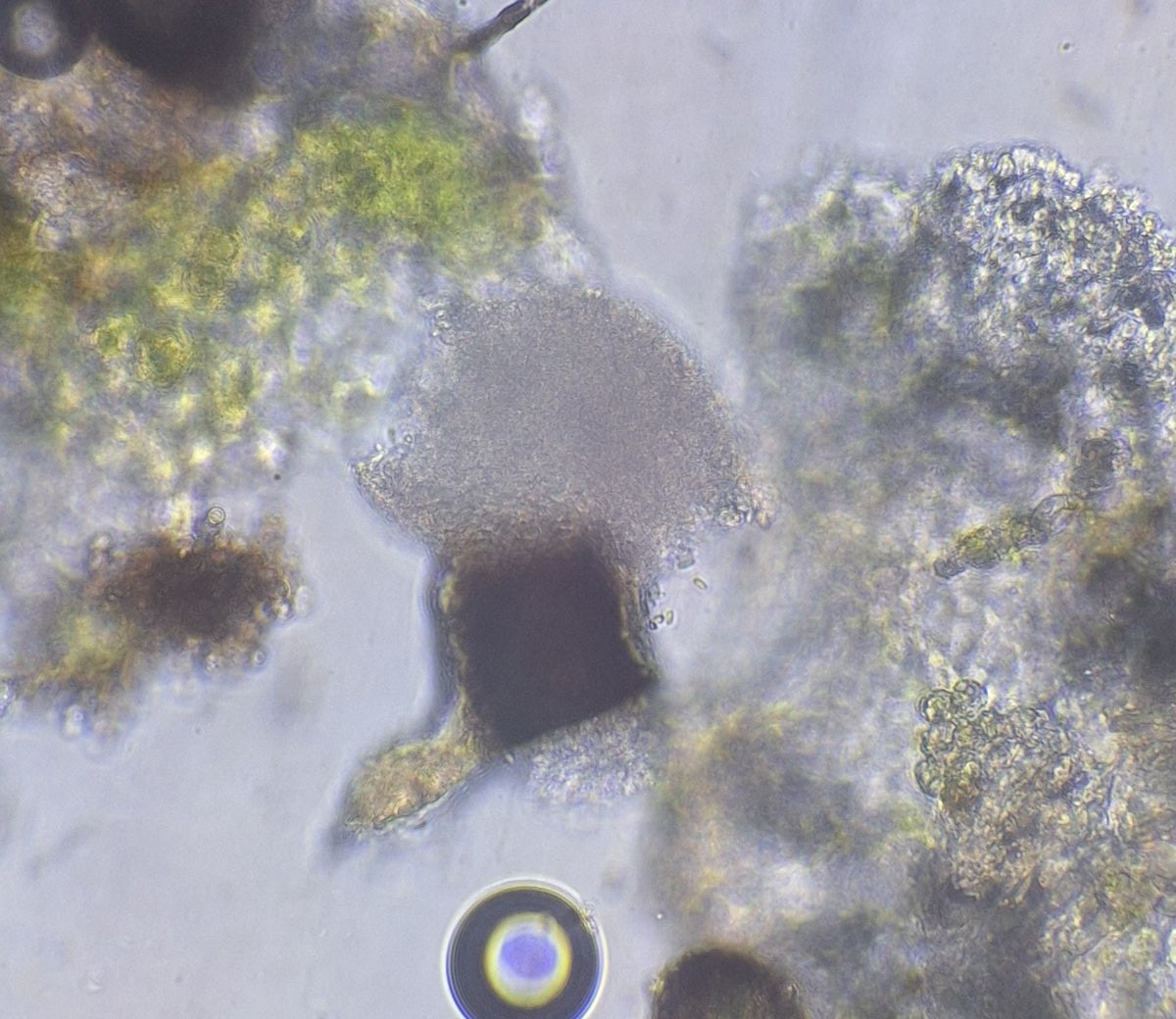 normal gequetscht, 40er, bei den braunen Kullern vermute ich Fremdsporen von der anderen Probe, Chaenotheca