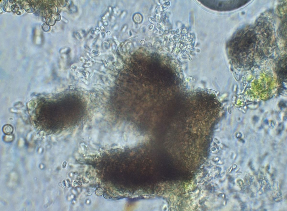normal gequetscht, 40er, bei den braunen Kullern vermute ich Fremdsporen von der anderen Probe, Chaenotheca