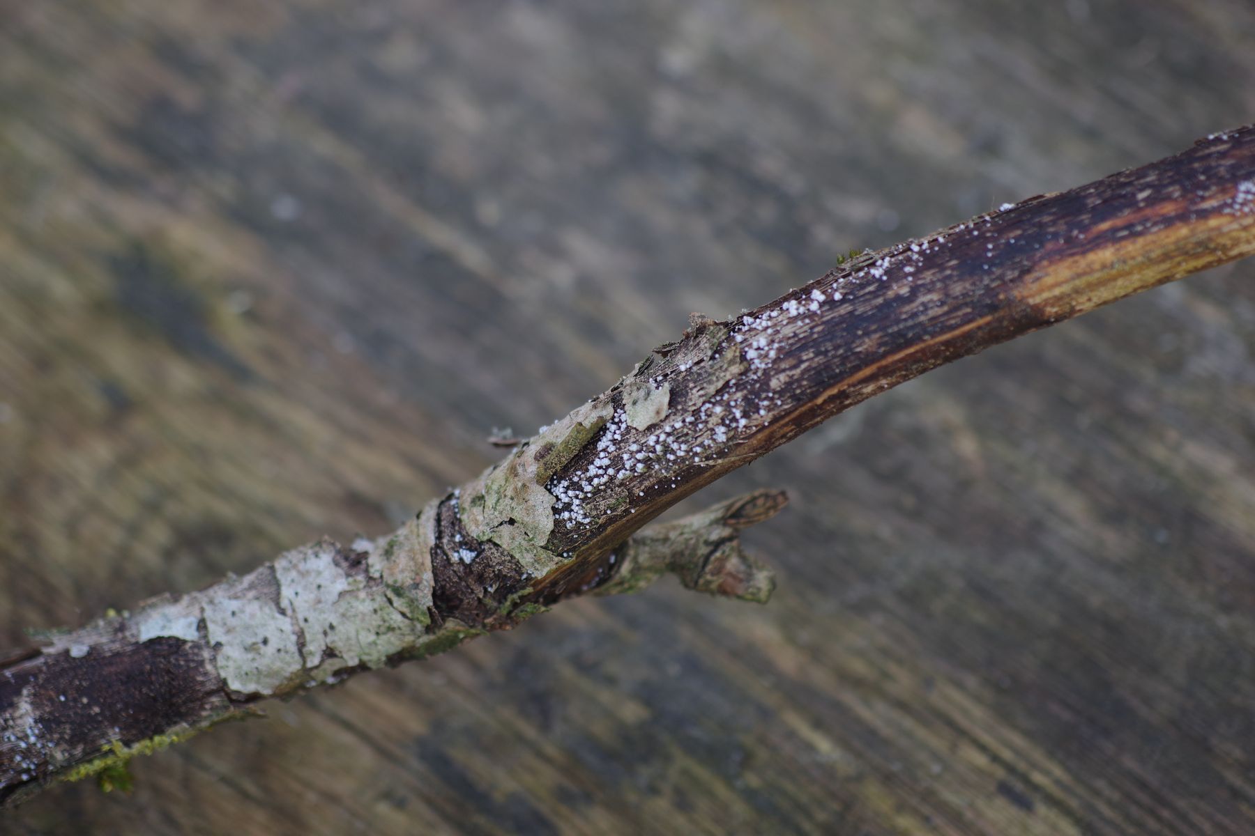 • N'abend, heute habe ich den noch an anderer Stelle an einem dickeren, heruntergefallenen Ast gefunden. Auch hier wieder auf dem Bast. Die Pilze etwas reifer aussehend und auch noch die vorherige Generation erkennbar.