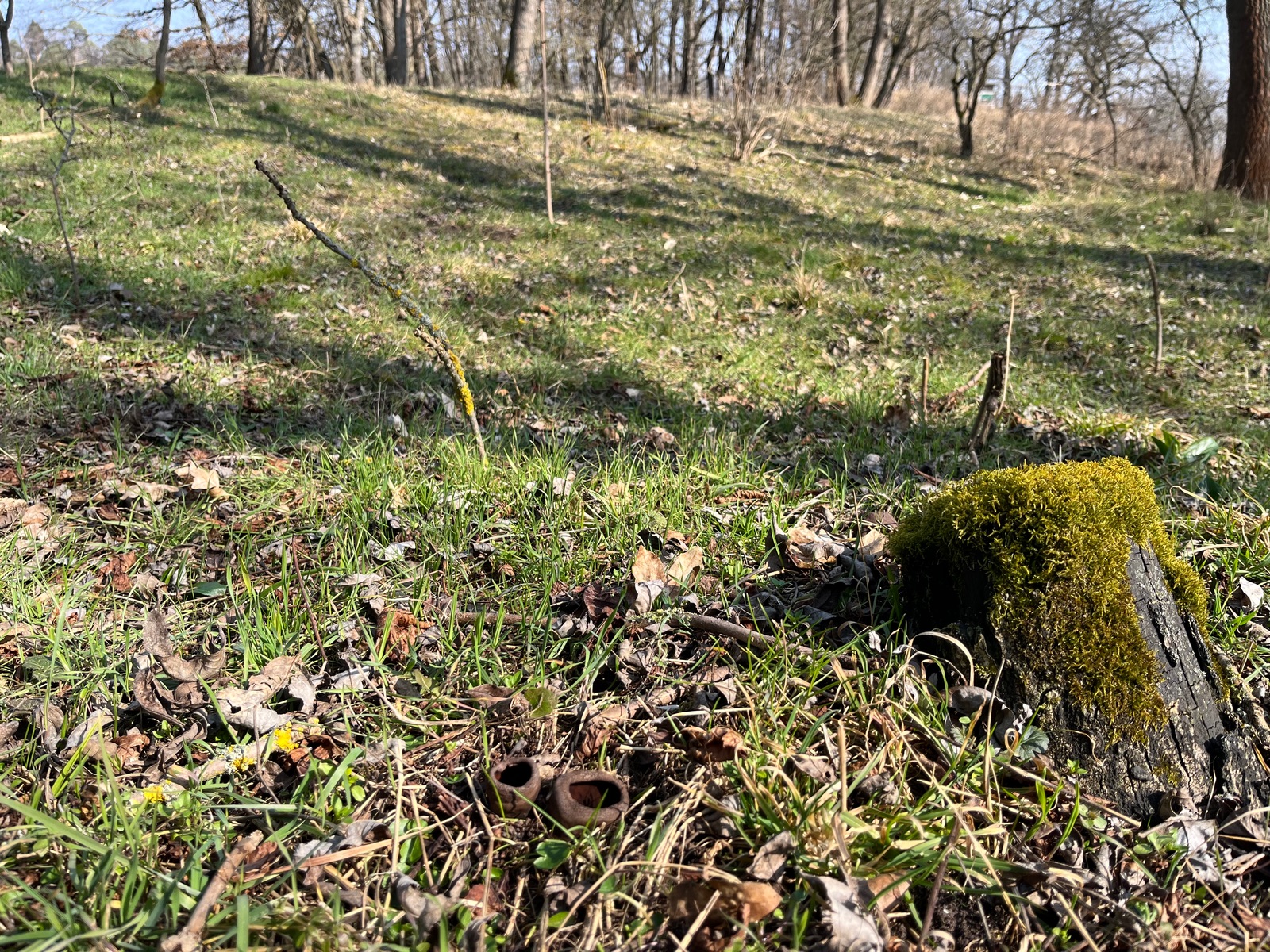 Hier ein Foto vom Tatort. Vorn die Urnen, dahinter in gerader Linie das ein Meter hohe Kastanienbäumchen.
