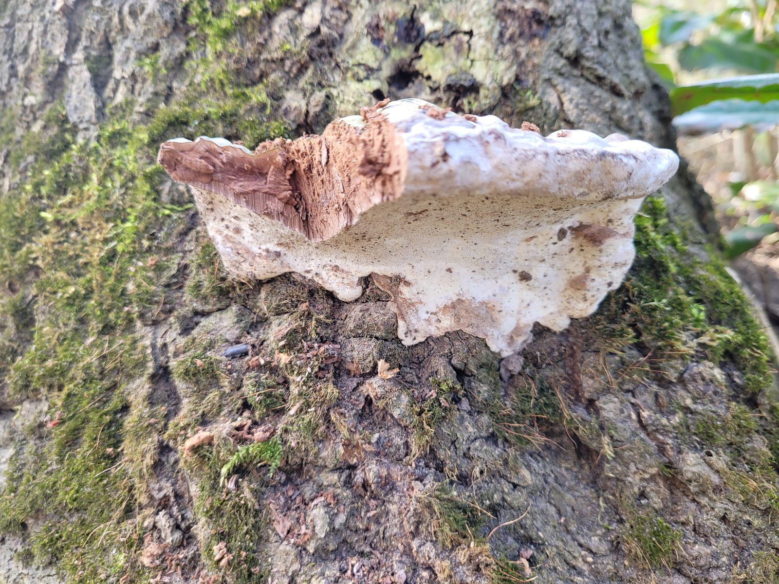 So kann man im Zweifel auch den Eichenschillerporling, Inonotus dryophilus (mit Mycelialkern) und den Tropfenden Schillerporling, Inonotus dryadeus (ohne) auseinanderhalten.