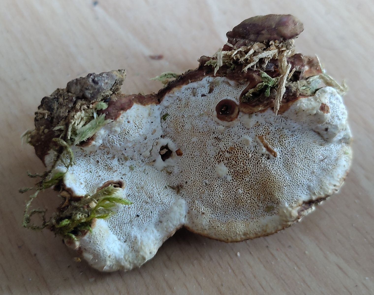 Die sind dann makroskopisch gar ned so leicht zuzuordnen. Die braunen Ränder um die Porenschicht oder um etwaige Störungen in der Porenschicht sind dann ein gutes Merkmal, das bei anderen zähen weißporigen Porlingen so nicht vorhanden ist.