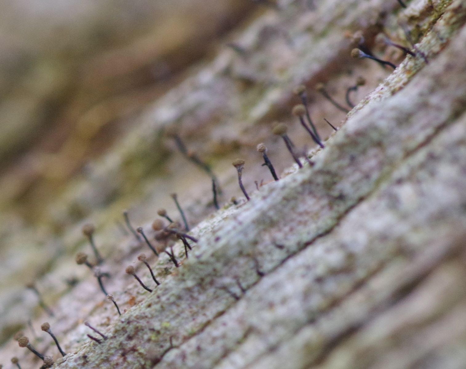 und dann habe ich noch eine unklare Chaenotheca, wo ich nirgends hinkomme. Auch vom Hof, von einem mächtigen Eichenklotz, der im Schatten steht, am Holz/Bastschicht, mäßig morsch