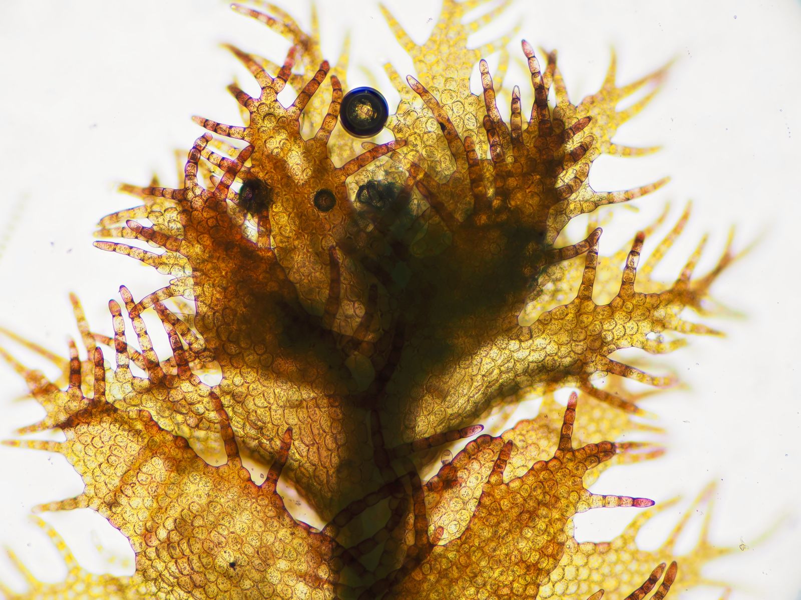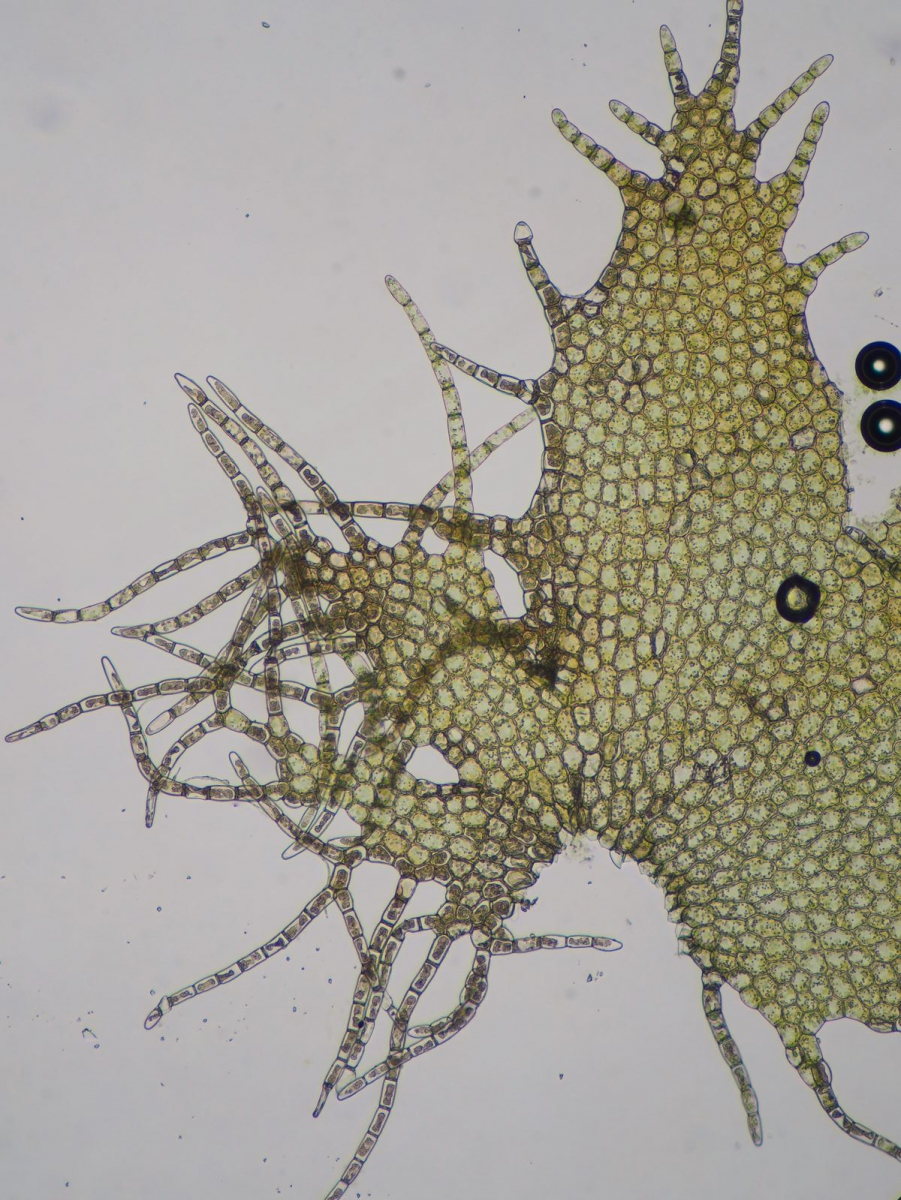 Um den Tau besser einfangen zu können besitzen die Moosblättchen feine Härchen, die unter der Lupe gerade eben zu erahnen, unter dem Mikro dann aber sehr deutlich zu sehen sind.