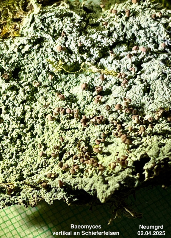 P.S.: Es gibt tatsächlich Baeomyces, deren Thallus sehr schnell tiefrot auf KOH reagiert. Wegen der sitzenden Apothecien und dem ungewöhnlichen Thallus habe ich eine ganze Weile gebraucht, um überhaupt auf die Gattung Baeomyces zu kommen. Die K+rote Reaktion war sehr eindrucksvoll: