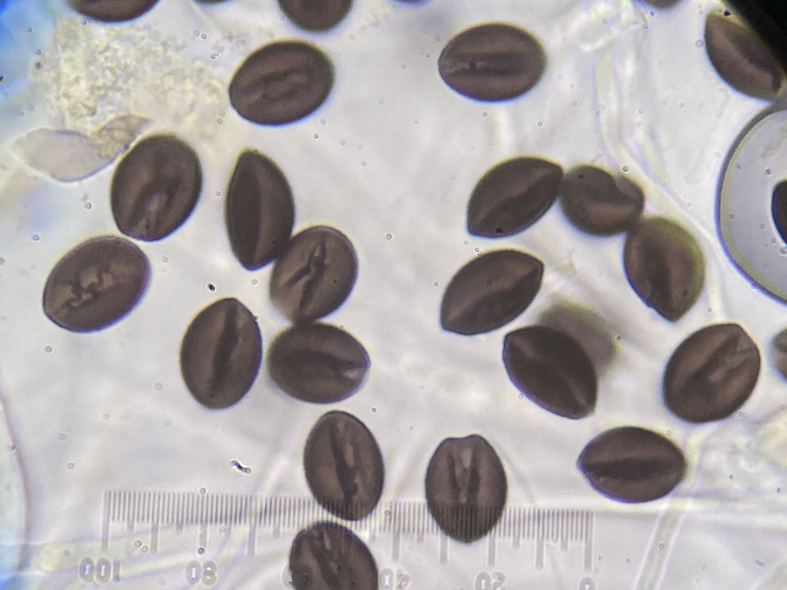 Dabei zeigt sich, dass Größe, Form und Farbe der Pollen deutlich anders sind als bei den Objekten in der Anfrage. Demnach kann es sich nicht um Pollen von Ahorn handeln. Vermutlich sind es Konidien der Art Nitrospora cf. oryzae. Dass ich keine zugehörigen Hyphen sah, könnte daran liegen, dass die Konidien bei dieser Gattung aktiv abgeschleudert werden. Oder ich hatte auf die separat liegenden dunklen Hyphen nicht geachtet, in der Meinung, diese würden zu Alternaria etc. gehören. Aber es gibt auch noch andere Hyphomycetenarten mit ähnlichen Konidien (z.B. Cordella sp.).