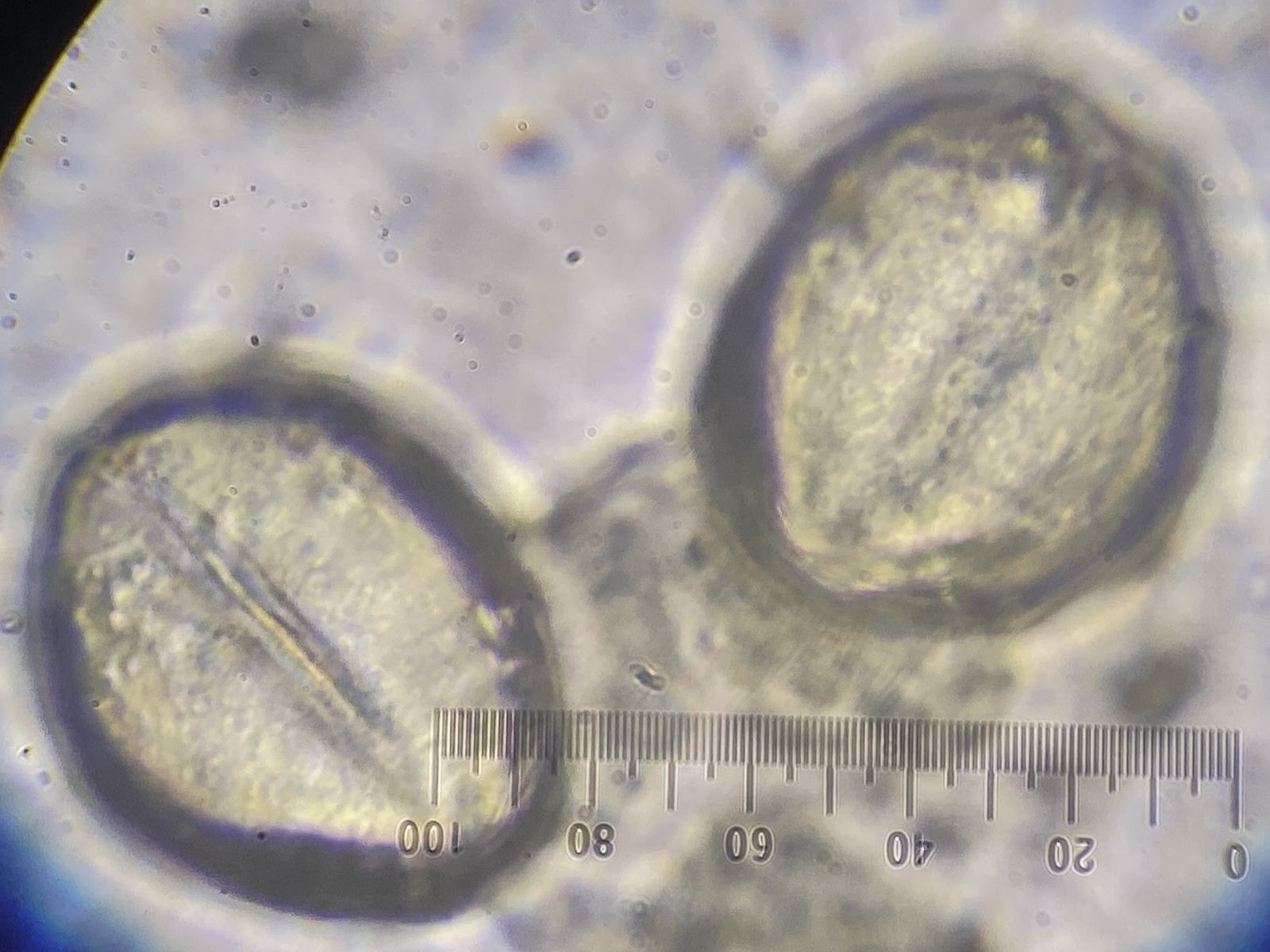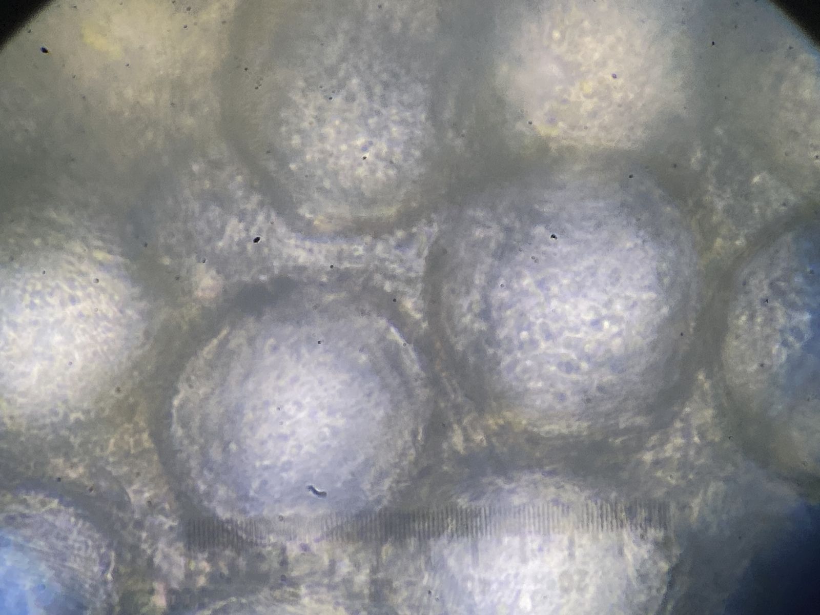 Da hier im 10er-Okular eine Skala integriert ist, wird Skala und Objekt immer zugleich vergrößert. Somit ist die Handy- oder Bildschirmvergößerung egal. Entscheidend ist nur das Objektiv (10x, 40x,100x). Die Größe des Objekts ergibt sich dann im Vergleich mit der Skala. Hier 0,6 µm pro Skaleneinheit beim 100er Objektiv.