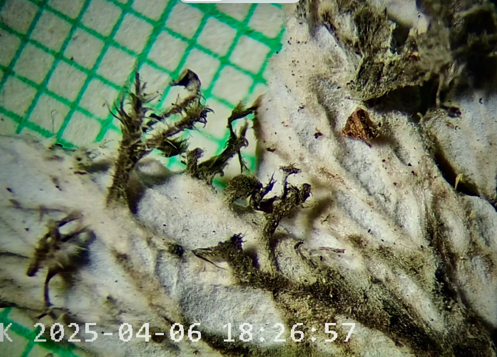 Bild B2 Winzige Isidien / Phyllidien am Thallusrand, unterschiedliche Rhizinen (auffaserndes, dunkles Rhizinenbüschelchen unscharf links) => also verm. doch Peltigera praetextata