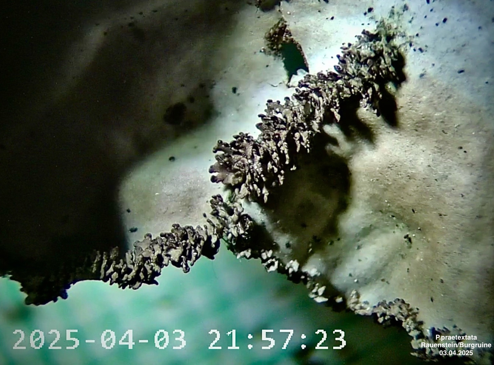 Bild B2 Winzige Isidien / Phyllidien am Thallusrand, unterschiedliche Rhizinen (auffaserndes, dunkles Rhizinenbüschelchen unscharf links) => also verm. doch Peltigera praetextata