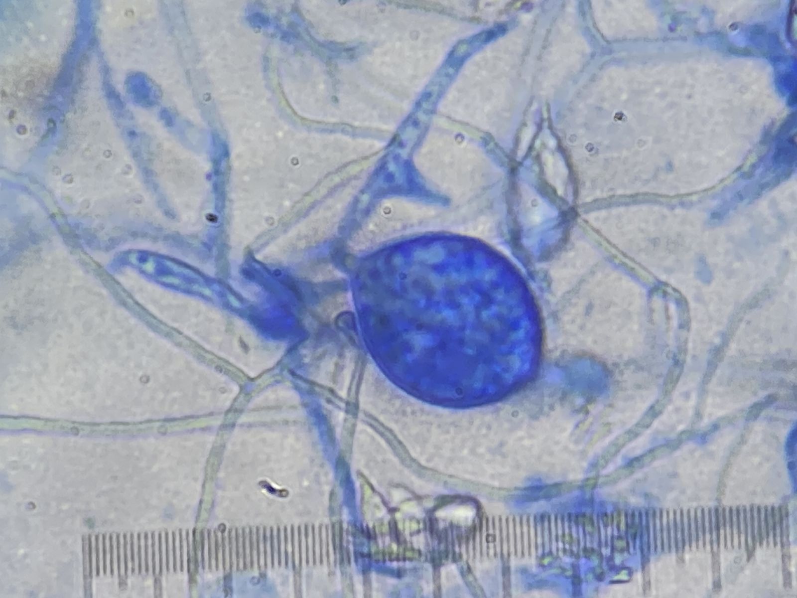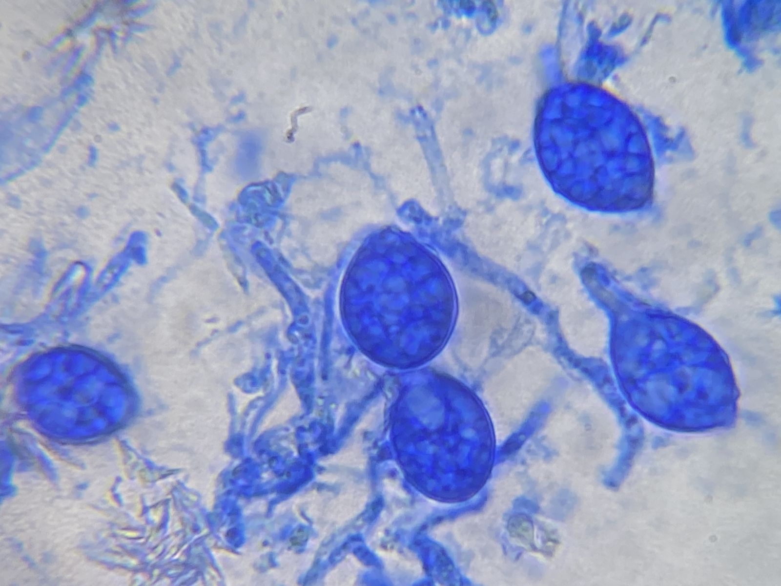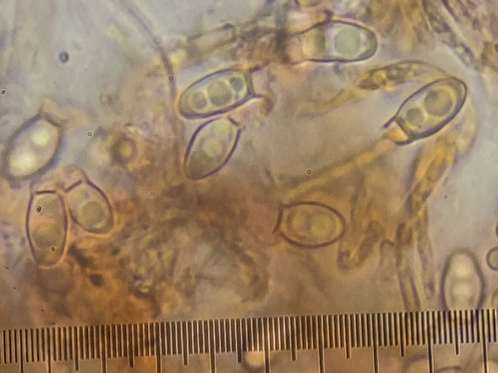 Der Pilz erinnert mich an die Fruchtkörper vom Mehltau-Hyperparasit Ampelomyces quisqualis. Dieser lässt aber auf Druck Massen an Konidien frei. Hier blieben auf Druck nur leere Hüllen zurück ohne jeglichen Konidienauswurf. Auffällig viele Kristalle waren auch zu sehen in Präparaten ohne Baumwollblau. Die Sporen vom Scytonostroma scheiden hier aus: sie sind amyloid, rund mit 5-6 x 4,5-6 µm.
