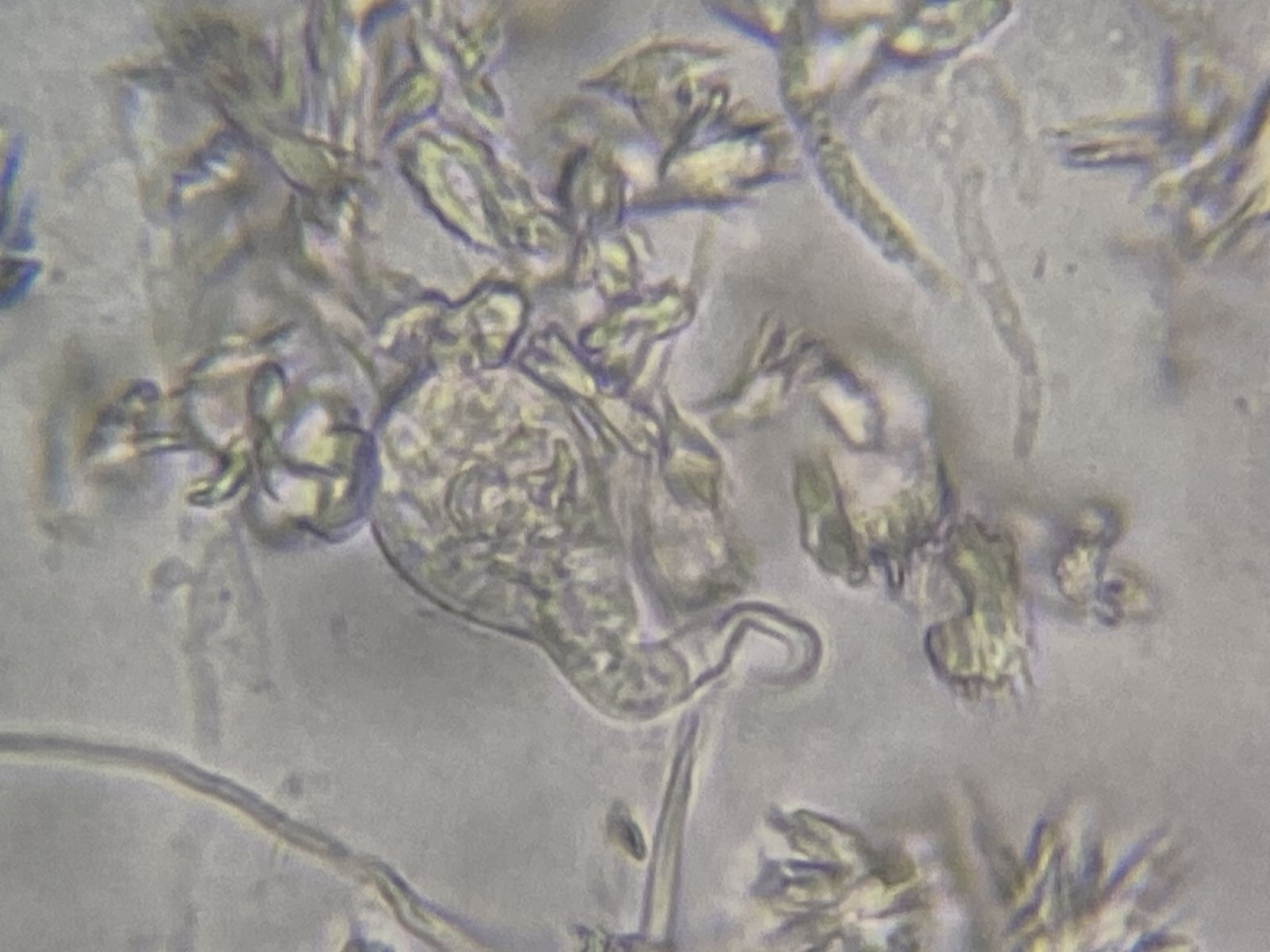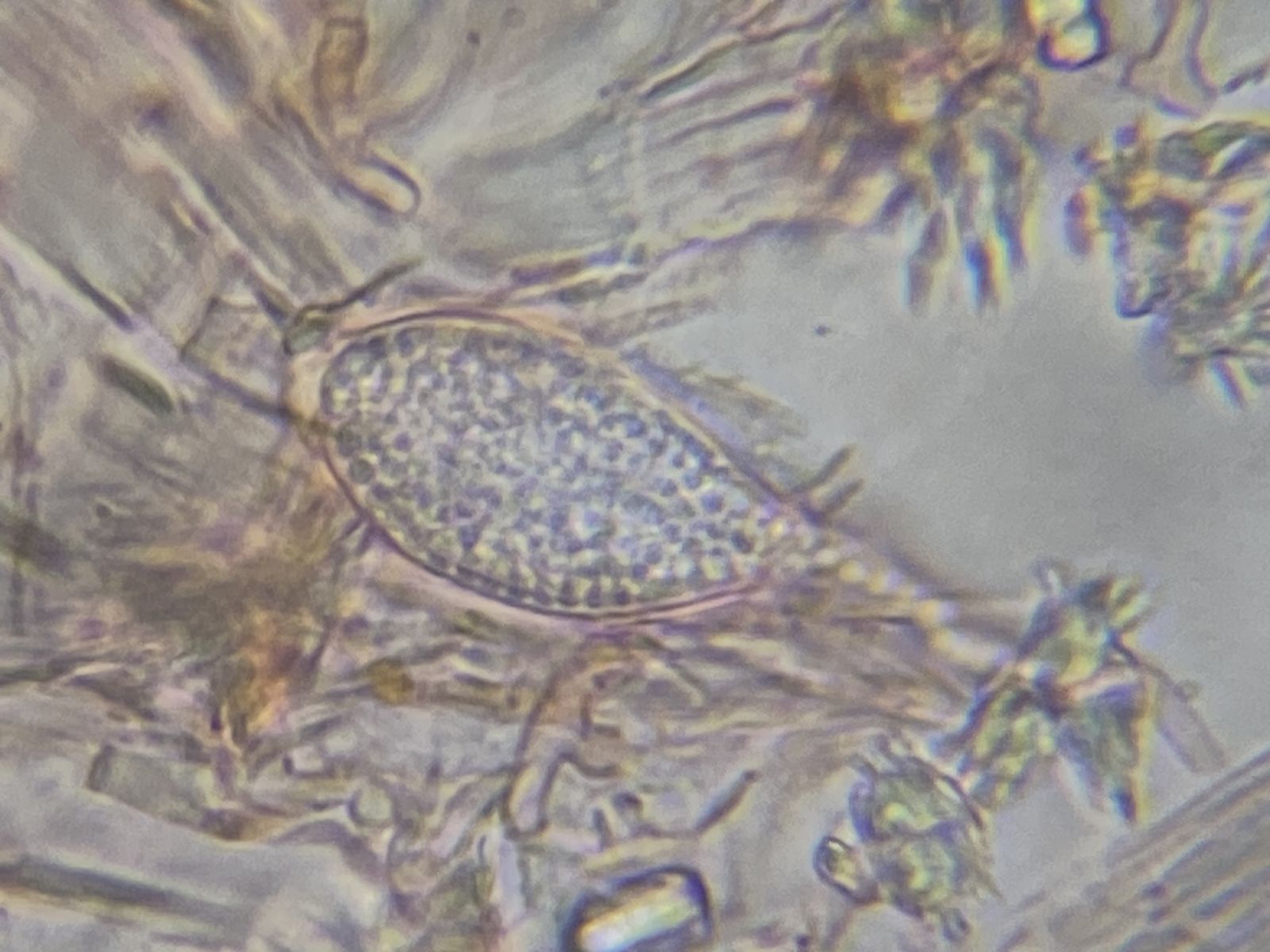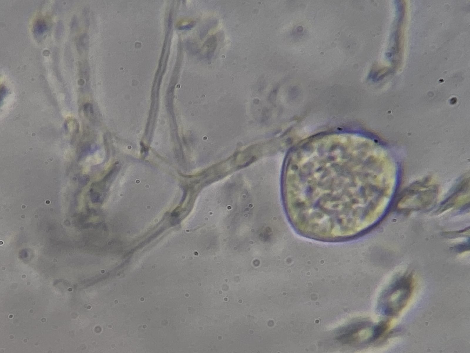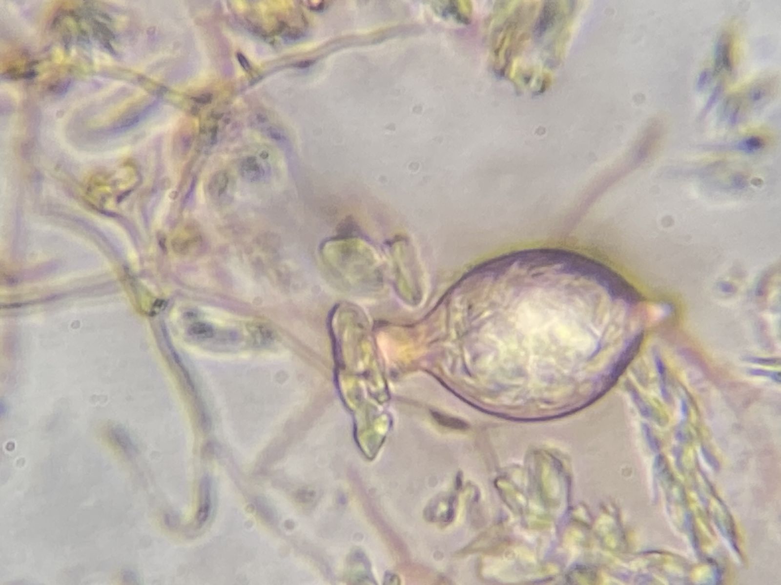 Der Pilz erinnert mich an die Fruchtkörper vom Mehltau-Hyperparasit Ampelomyces quisqualis. Dieser lässt aber auf Druck Massen an Konidien frei. Hier blieben auf Druck nur leere Hüllen zurück ohne jeglichen Konidienauswurf. Auffällig viele Kristalle waren auch zu sehen in Präparaten ohne Baumwollblau. Die Sporen vom Scytonostroma scheiden hier aus: sie sind amyloid, rund mit 5-6 x 4,5-6 µm.
