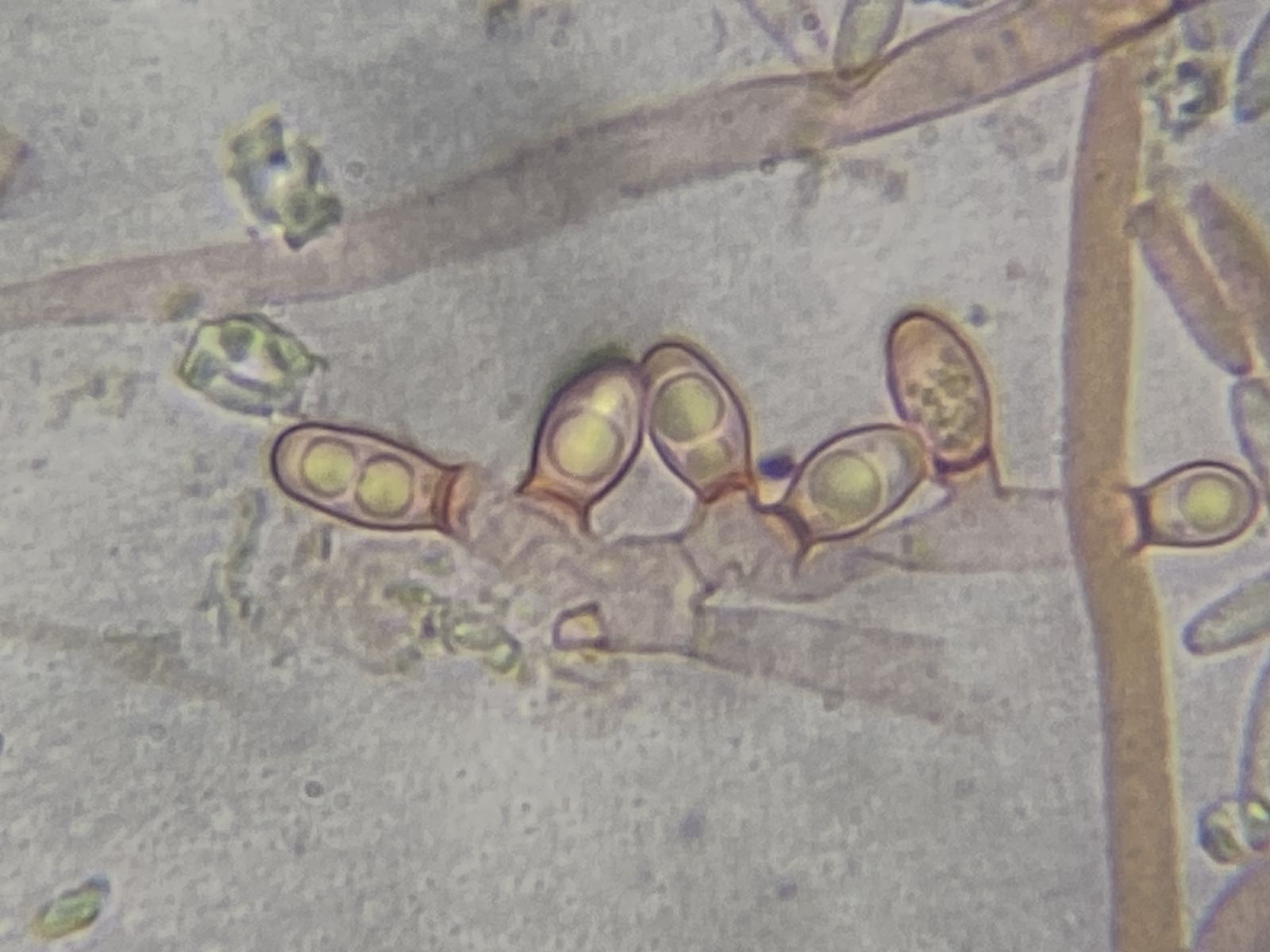 2) Konidien aufsitzend oder endständig auf breiten, häufig septierten Hyphen; 1-2 Vakuolen, ca. 8-9 x 2,5-4,5 µm; hyalin. Abgelöste Konidien haben zwei krallenähnliche Anhängsel als Anheftungsrest.