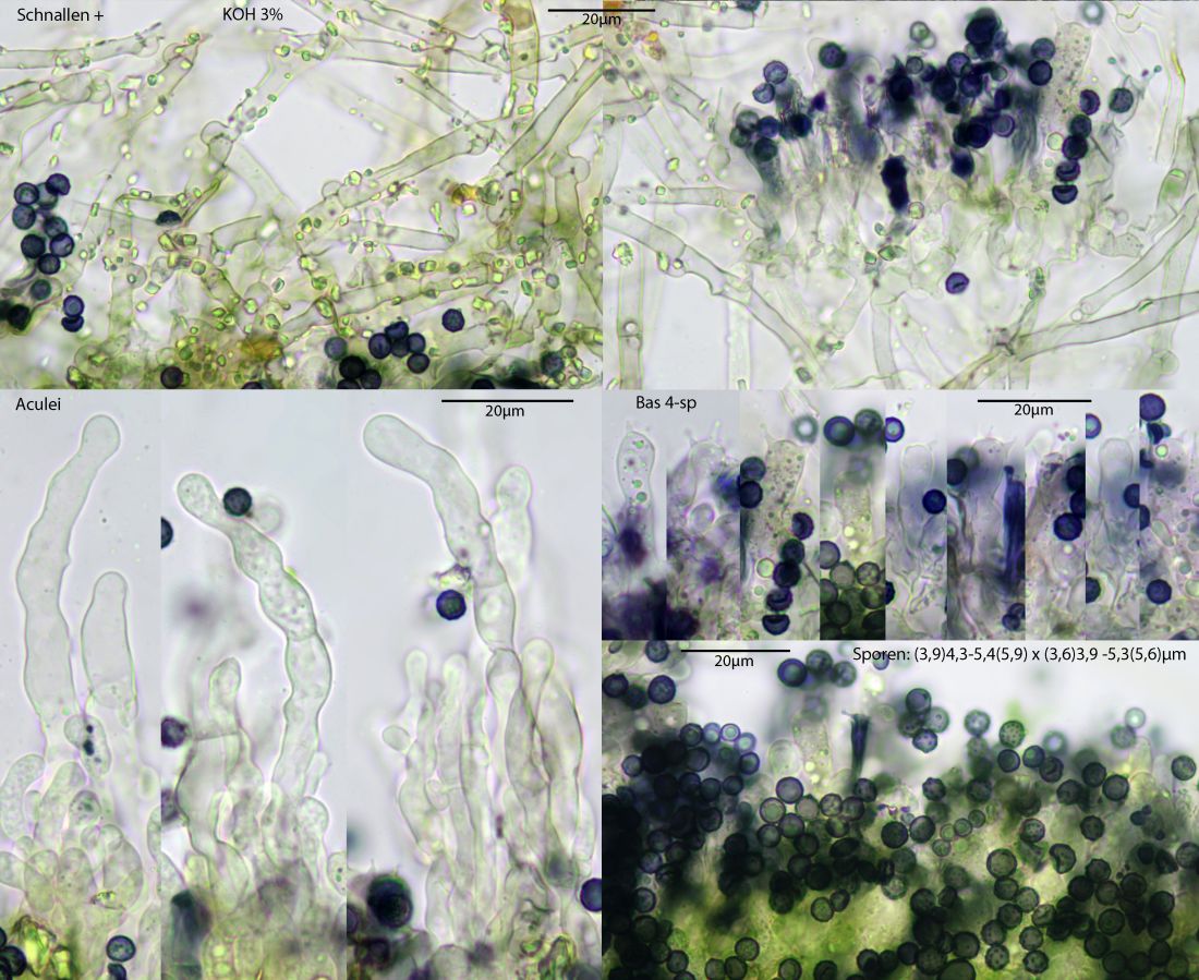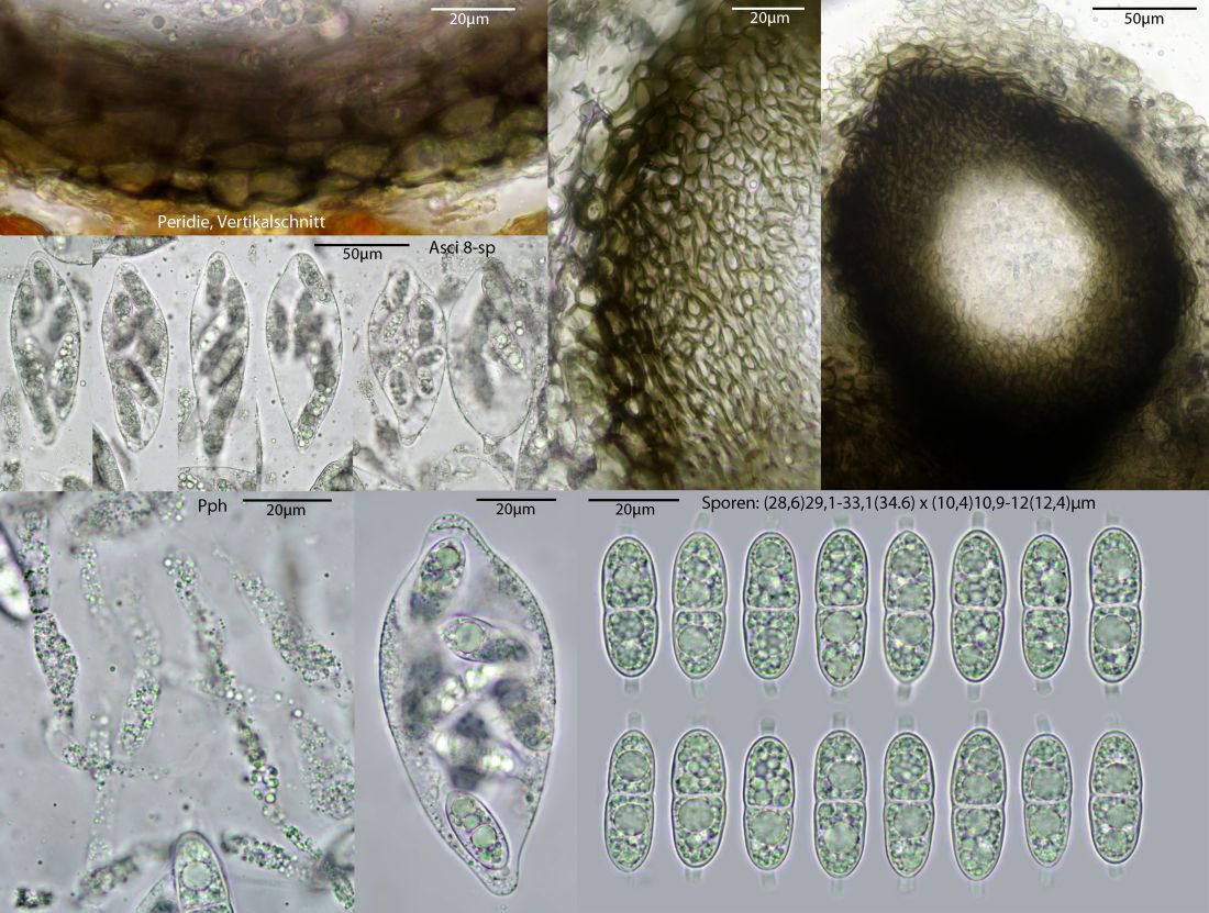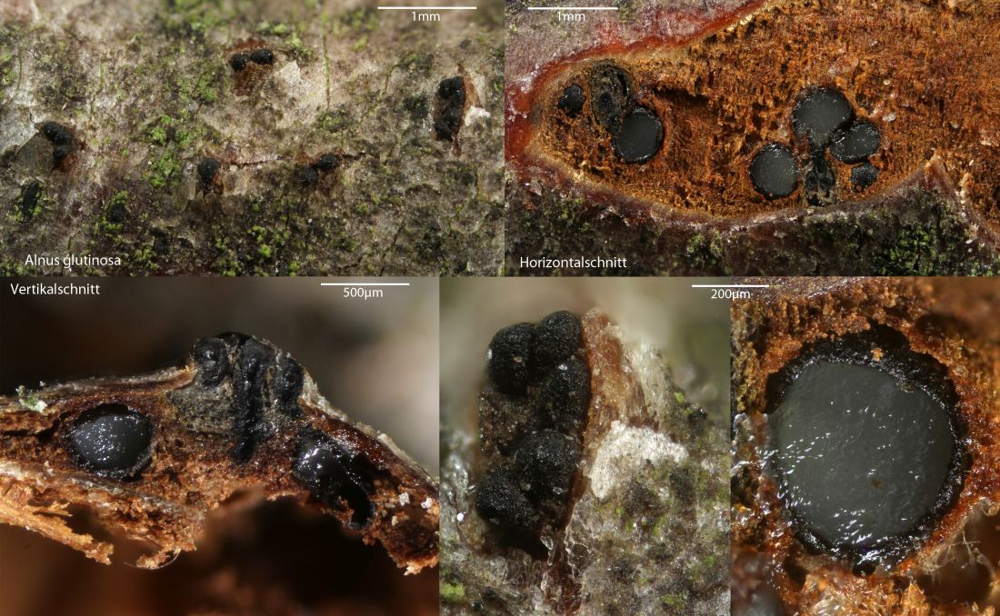 Wie der Gattungsname vermuten lässt, natürlich an Erle, Alnus glutinosa, gewachsen. Ist sicher häufiger, aber da hab ich noch nicht immer gezielt gesucht danach. Durch die Sporengröße und das Substrat schon gut charakterisiert. Ähnliche Sporen haben z.B. Arten der Gattung Prosthecium, in der die Art früher auch stand: