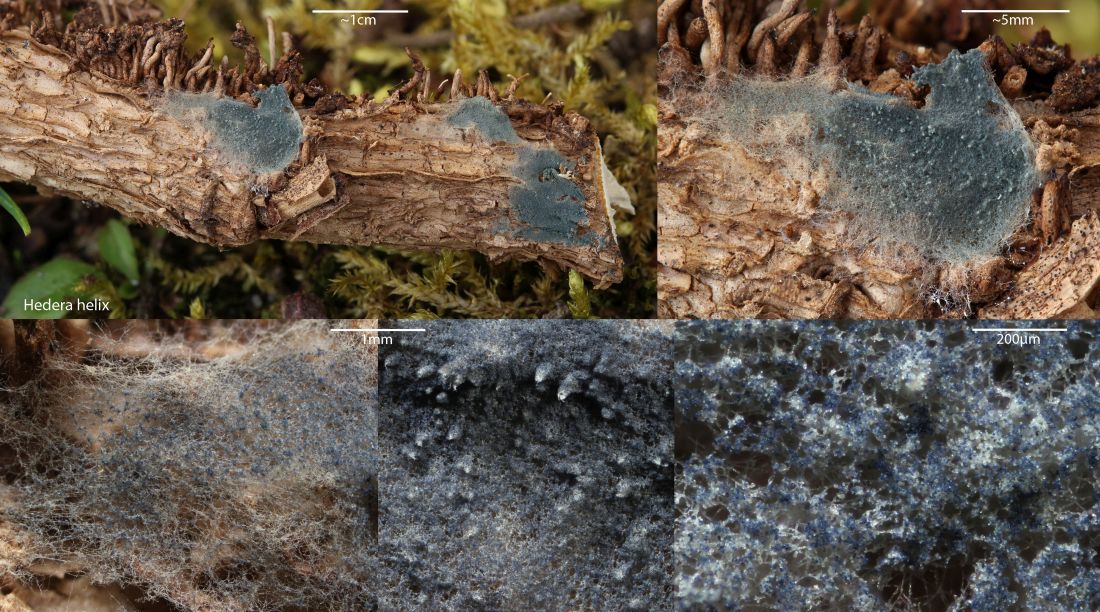 Diesen Rindenpilz suchte ich wegen der attraktiven Mikromerkmale schon lange. Nun in einem Garten unverhofft an Efeu gefunden, als die Efeuranken weggeräumt werden mussten, weil ein Baum umgeknickt war.