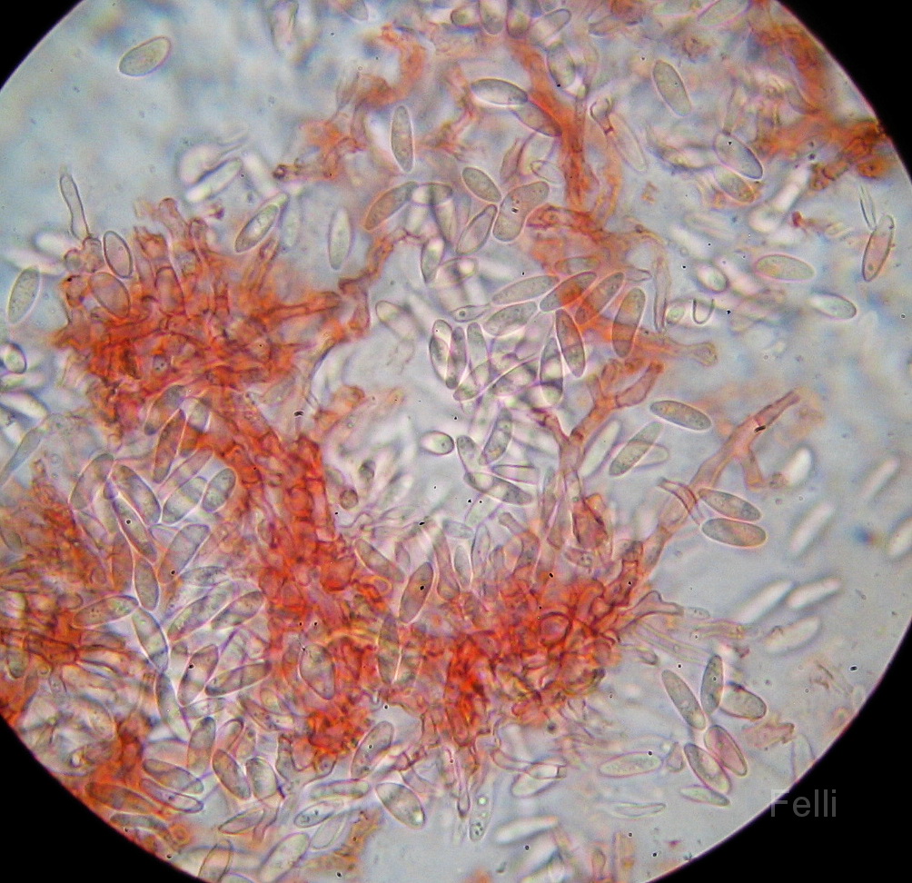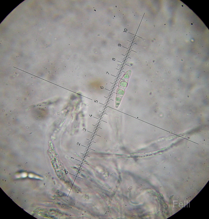 Die Sporen sind 10-15 x8,5-12µ, teils mit kurzem Stielchen, mauerförmig septiert, braun-grau