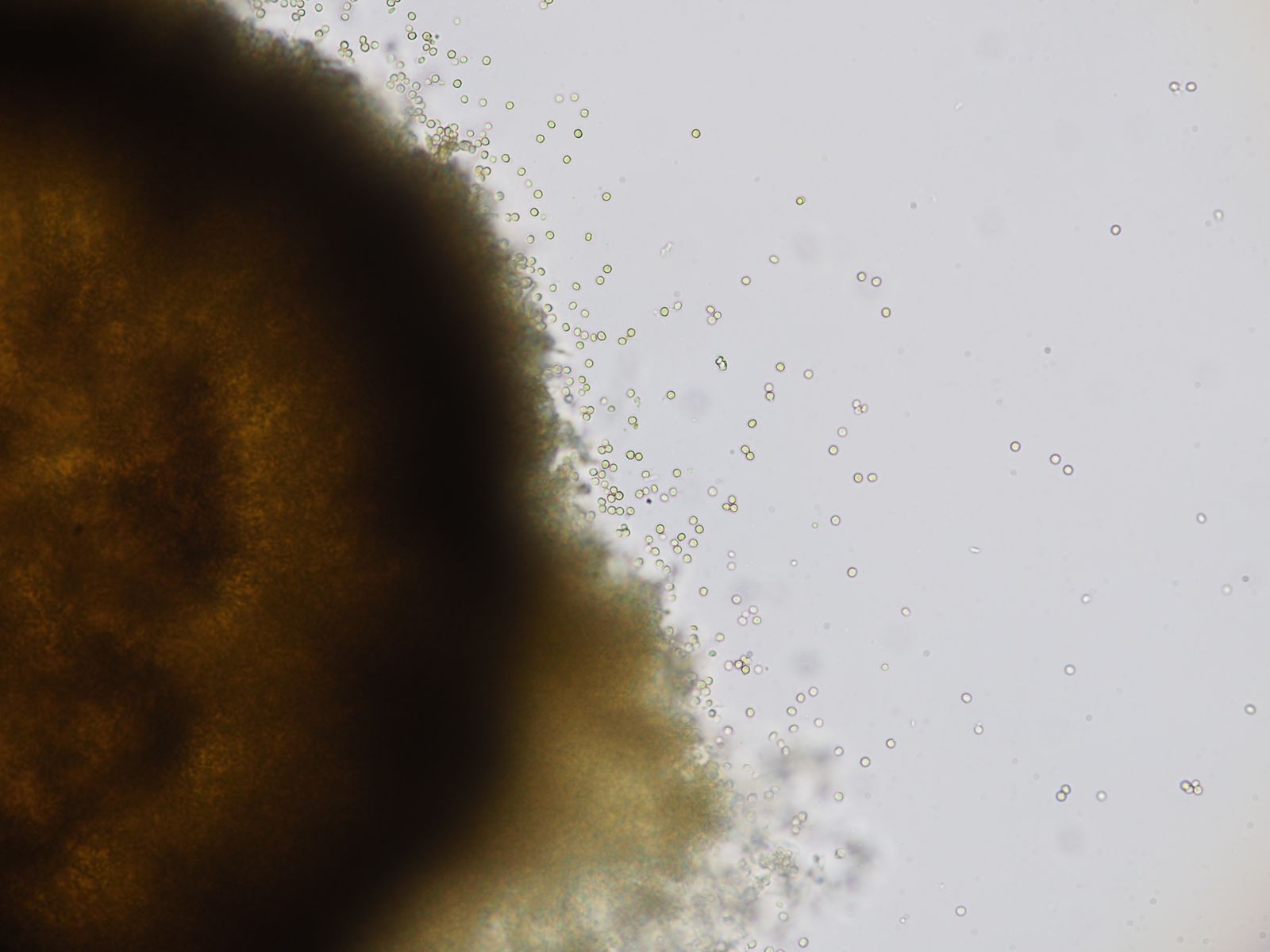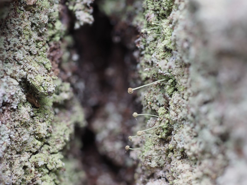 in Rindenrissen einer alten Eiche fand ich bei einem der letzten Familienausflüge eine Stecknadelflechte mit einem für die Gruppe extrem langen Stiel und kugelförmigem Mazaedium. Der Stiel war ca 4-10x so lang wie der Kopfdurchmesser, was bereits mit blossem Auge zu sehen ist. Unter der Lupe ist zu erkennen, dass sowohl der mint-grüne Thallus als auch die gesamten Fruchtkörper feinmehlig bereift sind. Bernd hatte sie vor einiger Zeit mal als typischen Bewohner von Wurzeltellern umgestürzter Nadelbäume vorgestellt. An solchen hatte ich bisher aber nie Glück, sodass ich dann etwas erstaunt war sie an Eiche zu finden. Das dürfen sie aber je nach Literatur durchaus. Sporen (sub)globos (2.3) 2.4 - 2.8 (3.1) × 2.15 - 2.7 (3) µm Q = 1 - 1.17 ; N = 25. Asci konnte ich keine (mehr) finden. Italic führt die Art unter Coniocybe furfuracea (L.) Ach.