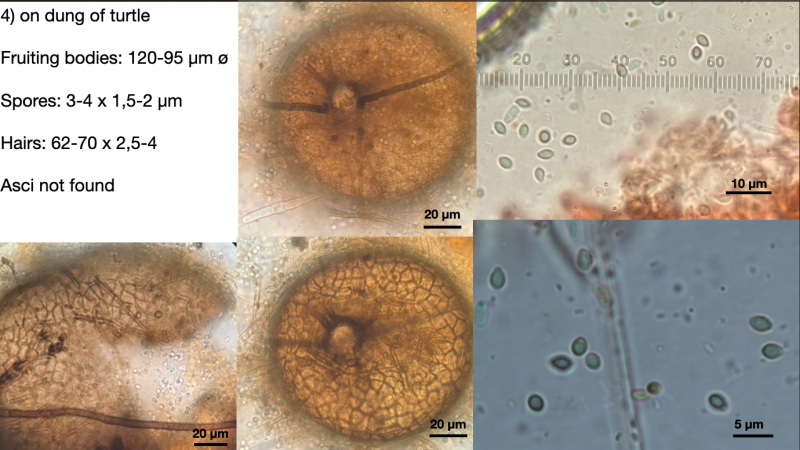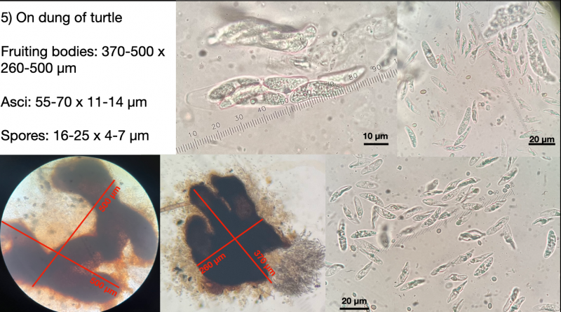 Für meine Masterarbeit beschäftige ich mich mit koprophilen Pilzen auf Schildkrötenkot und verschiedenen Vogelarten. Die meisten Pilze habe ich bereits identifiziert, aber bei manchen fällt mir die Bestimmung auf Gattungsebene, geschweige denn auf Artebene, immer noch schwer. Ich hoffe, Sie können mir bei der Bestimmung dieser Arten helfen. Anbei finden Sie Bilder und Maße aller 6 Arten.