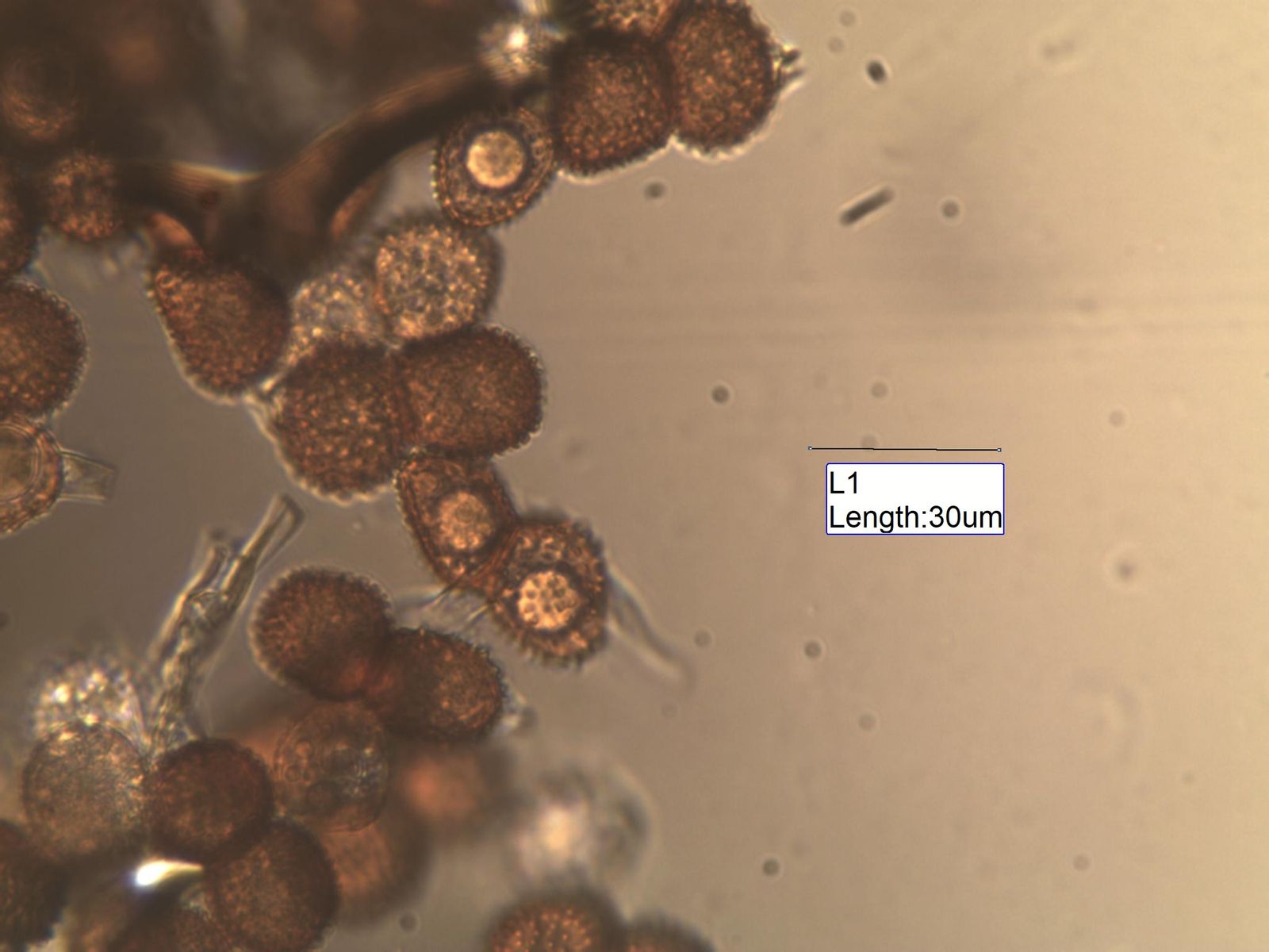Schöne warzige, 1mal septierte Sporen.