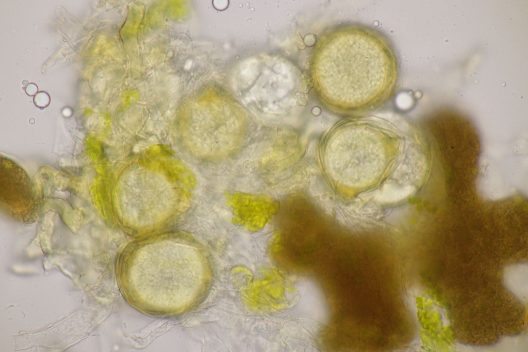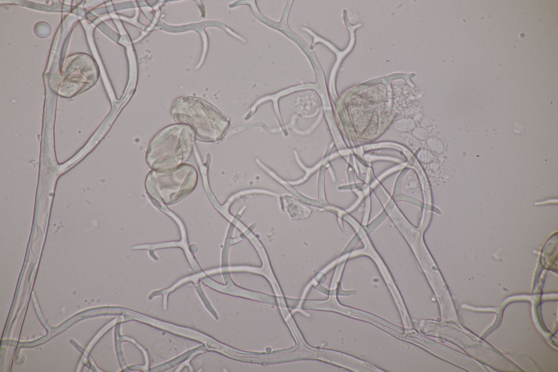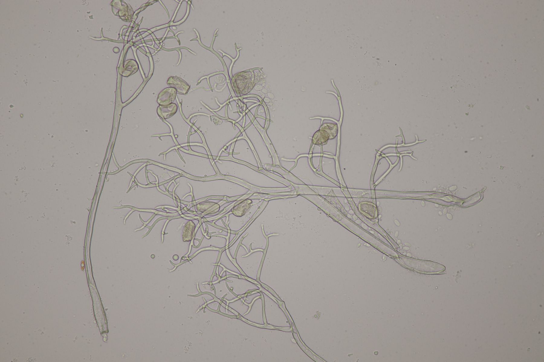 bei der gestrigen APR-Exkursion am Hohenstein in Witten konnte ich den falschen Mehltau Peronospora chrysosplenii auf Chrysosplenium alternifolium finden. Befallene Pflanzen sind blaßgrün verfärbt, die Blütenstände verfärben dann später auch ins Bräunliche. Auf der Blattunterseite findet sich ein gräulicher Pilzrasen aus Konidienträger. Diese sind wie bei falschen Mehltauen üblich mehrfach dichotom verzweigt. Die Konidien sind gräulich, eiförmig und messen im Mittel 24 x 20 µm. In den braun verfärbten Pflanzenteilen waren auch Oosporen zu finden. Diese sind rund, hellbraun und messen 30-48 µm im Durchmesser.