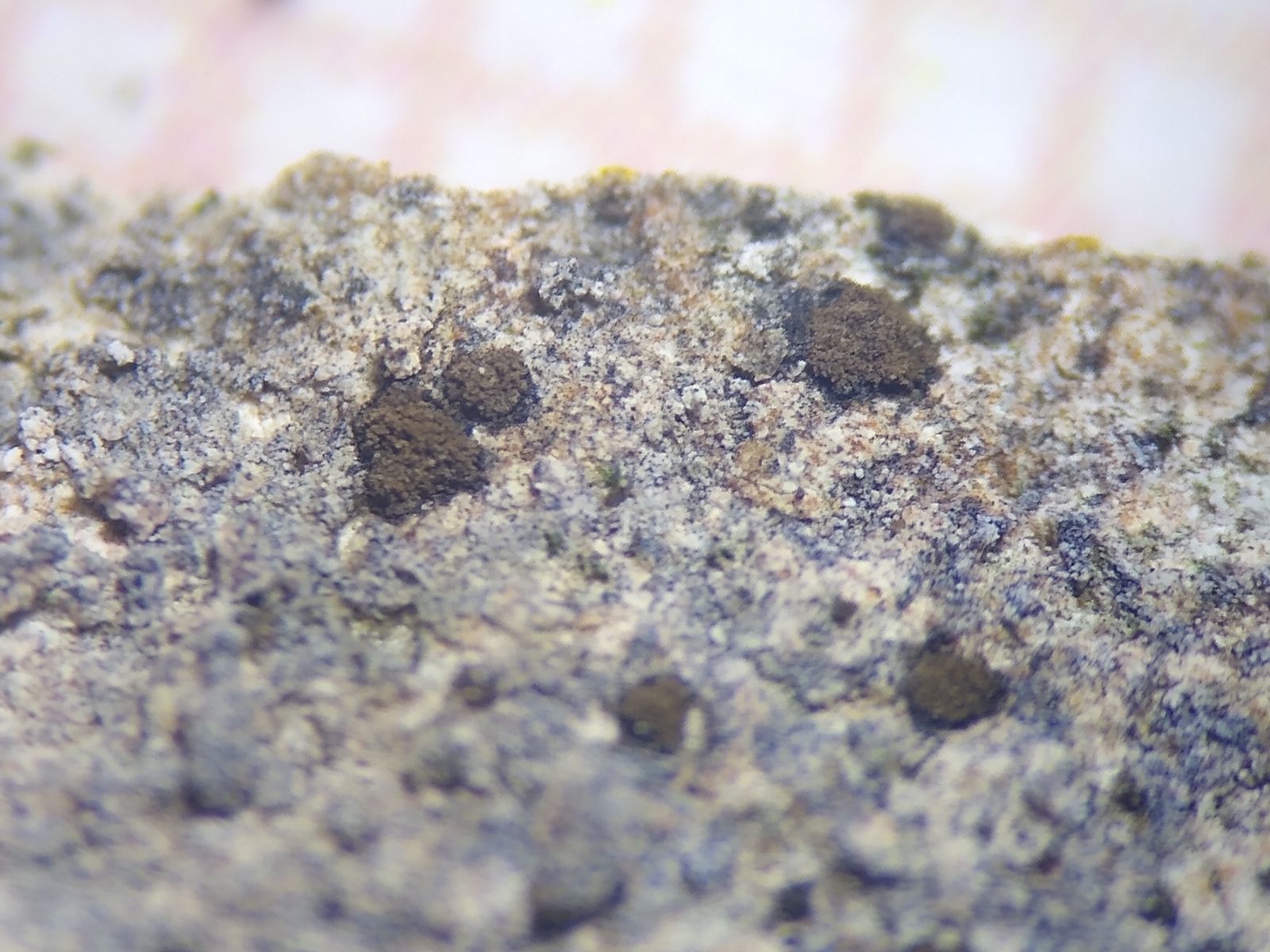 Bild 7 Probensplitter: Braune Soralen mit schwarzem Rand auf grauem Thallus