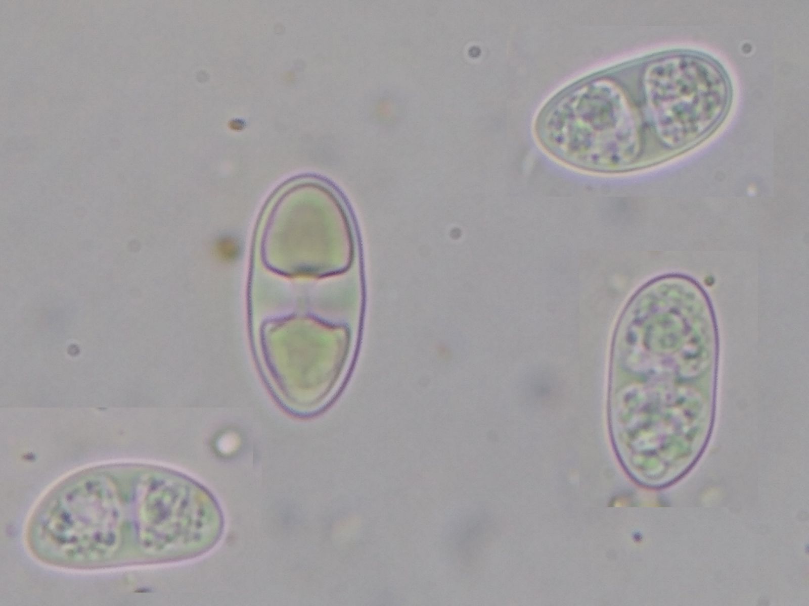 Die 2-zelligen Sporen sind deutlich polarilokular, breit ellipsoid.