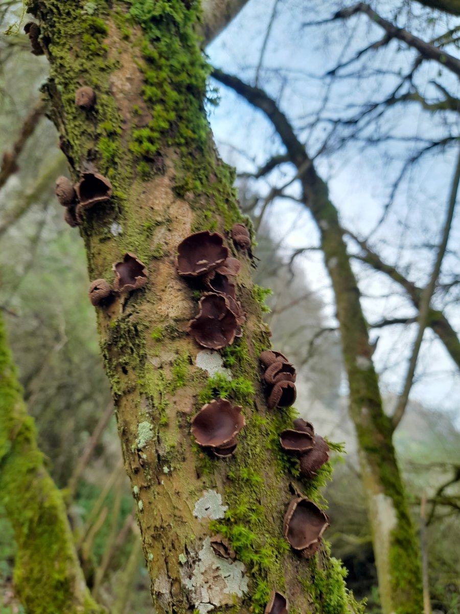 An bekannter Stelle vollentwickelte Exemplare des Kleiigen Haselbecherlings (Encoelia furfuracea)
