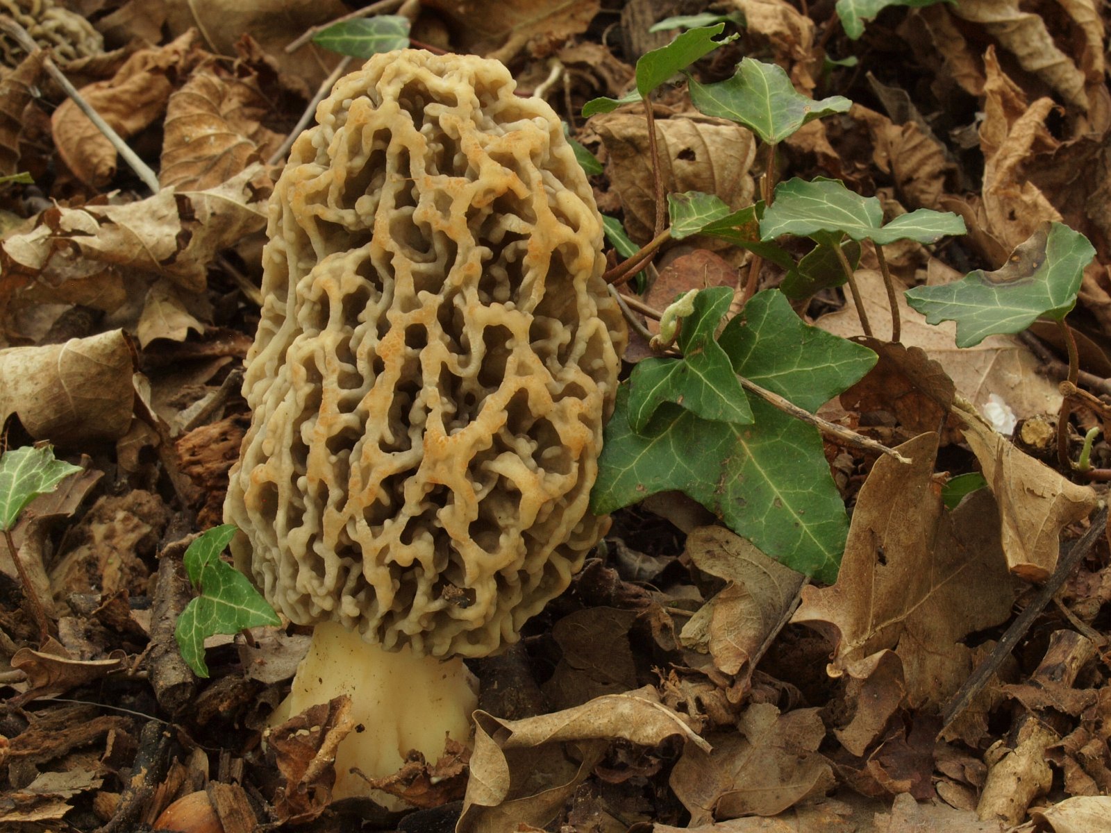 Morchel (Morchella cf. vulgaris) mit Efeu