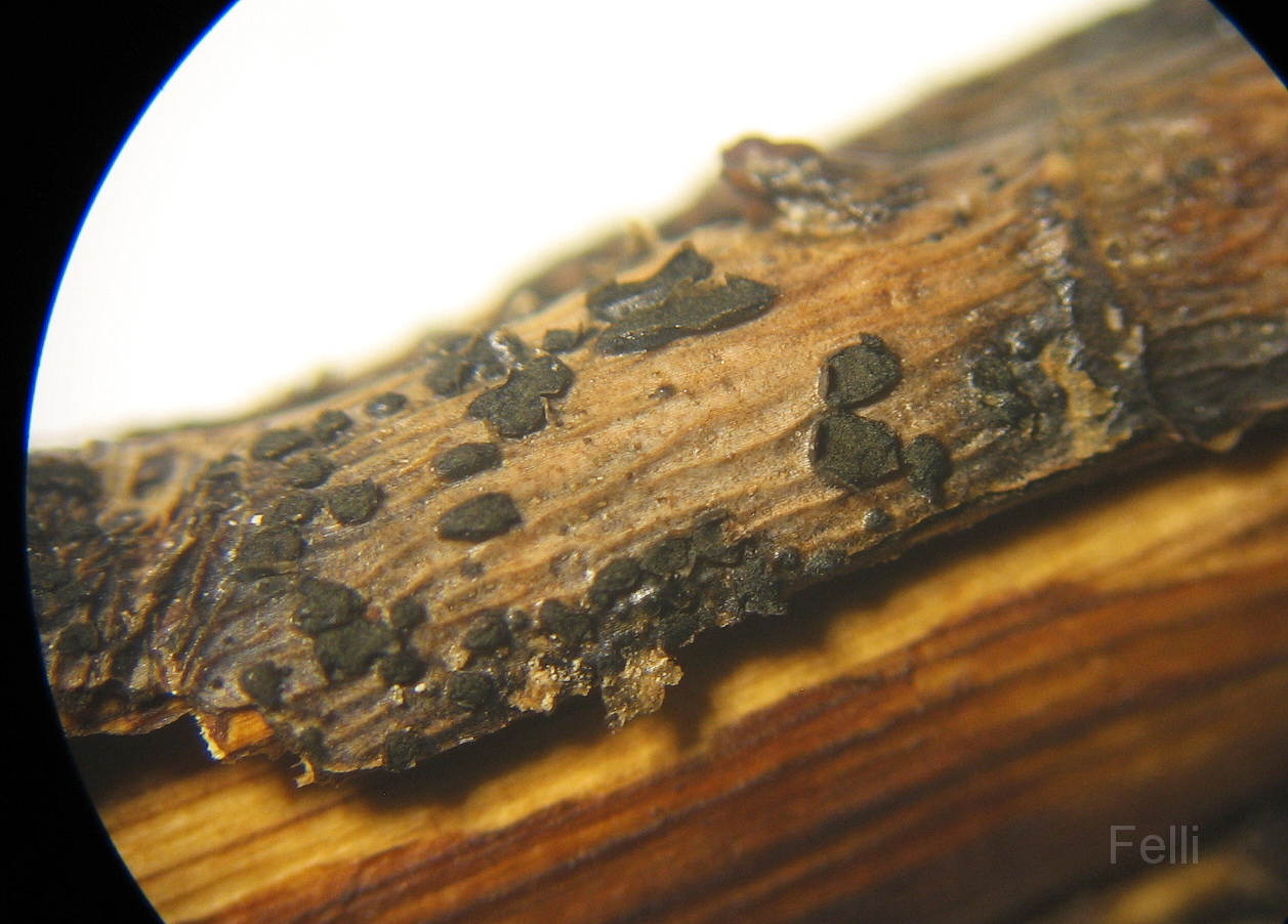 An einem abgestorbenem Rosenzweig fand ich ein paar dunkle Flecken,
