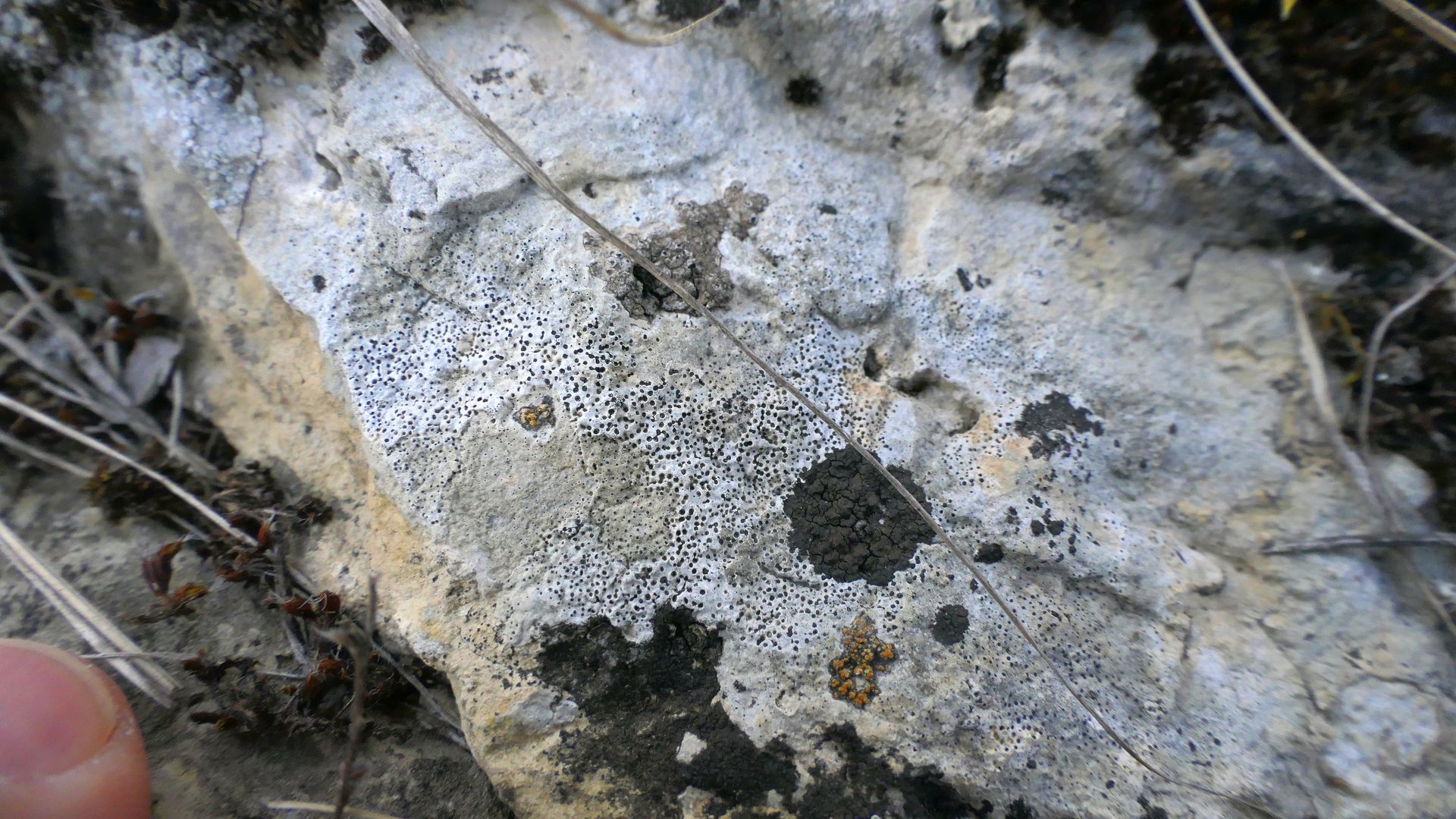 Der Kalkstein selbst erscheint schwarz durch Verrucarien, die darauf wachsen.